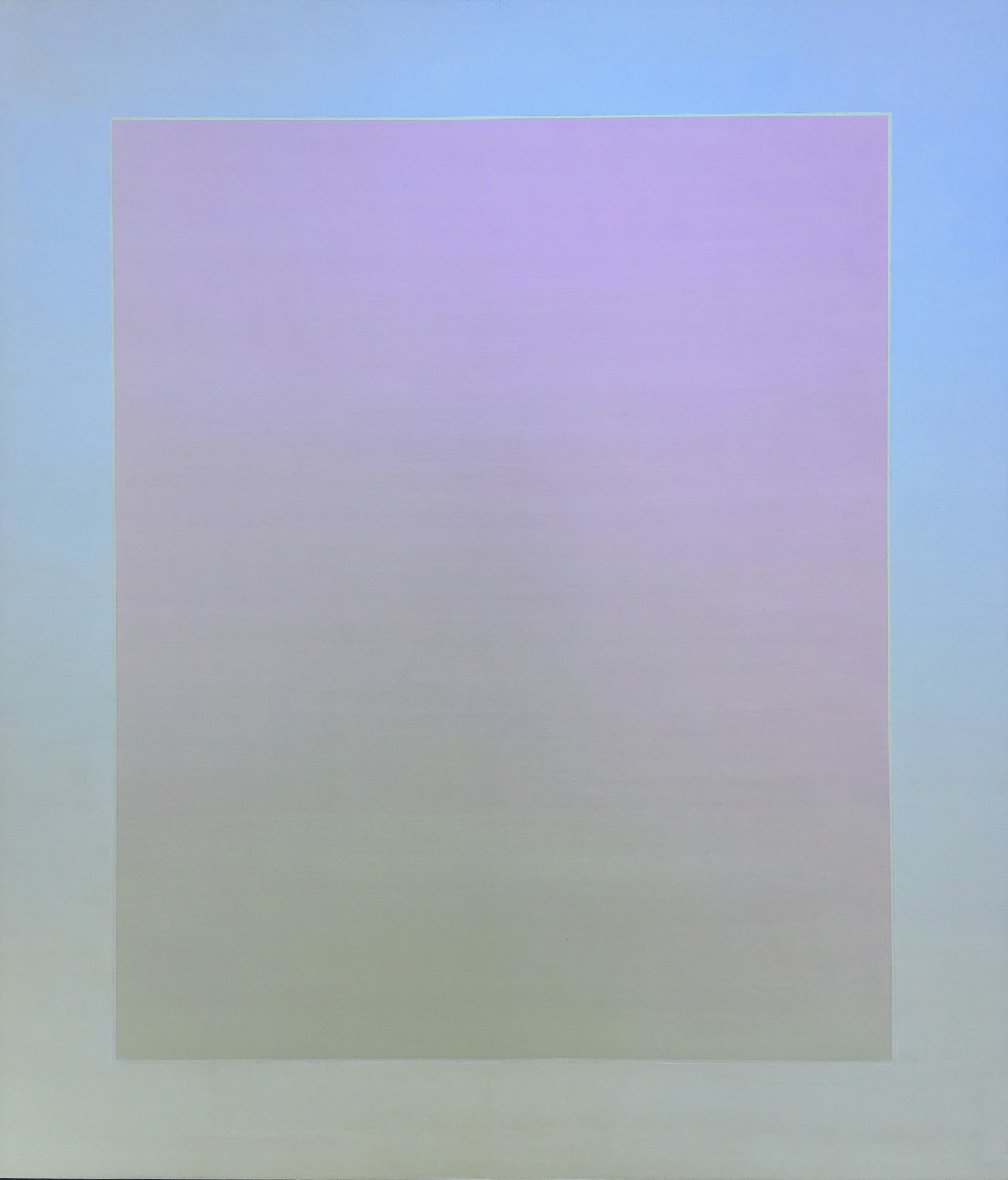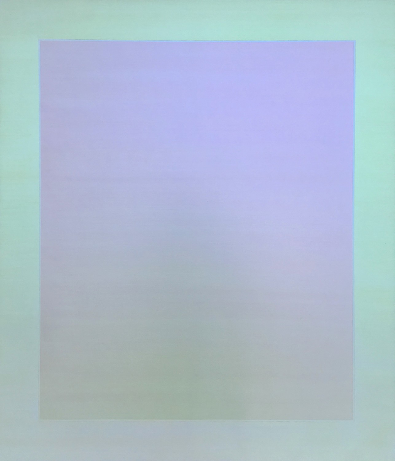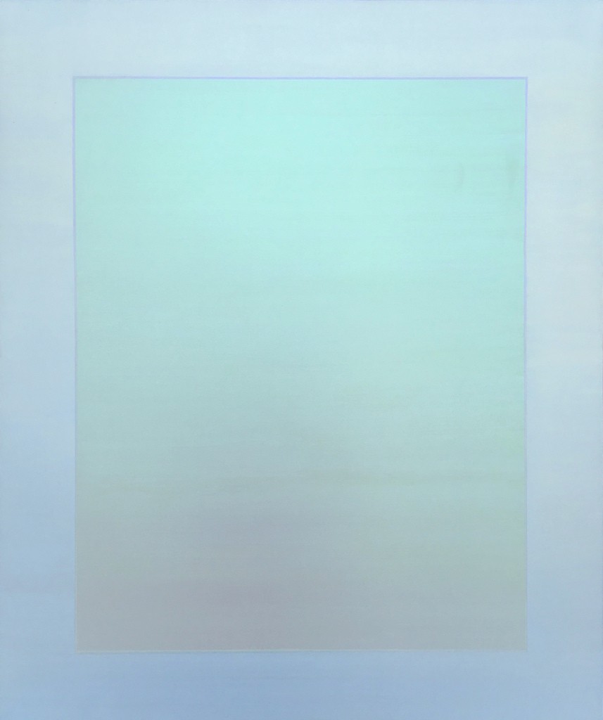 Violet reflects from the top corner of the canvas as it slowly fades to a greenish hue towards the bottom while a half a blue circle floats at the center slowly fading towards a yellow half-circle. As the viewer moves in one direction the colors seem to shift and where there was violet there is a pale green, and where there was a pale green there is violet. Simultaneously, the blue circle has shifted completely to yellow doubting the viewer’s perception or perhaps memory causing the viewer to retrace their steps to confirm or look for the colors just recently observed. Once recovered, the viewer moves slowly in another direction to closely observe the changing colors in the painting as their eye and body move around the painting. Eventually they move up and down to see the shift occur vertically, and then all around perhaps in circles bending their knees and moving their necks side to side. This dance or movement in front of Shingo Francis’ series of paintings “Illuminated Presence” is often the experience while interacting with a new iteration of “Intereference”, which refers to the type of material Francis employs in the production of the canvas. Francis chose the circle as the compositional structure in this series of paintings to re-examine a ubiquitous form found in nature from the microscopic to the cosmic. Francis states, “the simplified composition is a continuation of a body of work utilizing a light sensitive painting material that reveals the color spectrum in light. The colors of the painting change as the viewer walks around the painting, creating a phenomenological experience in perception. The circle is a reference and representation of the form itself in regards to the many meanings, interpretations, symbols or structures in nature, civilization, culture, and spirituality. Together with the perceptual phenomena of the painting material, the circle embodies the ever-changing nature of existence within the structures that either governs our lives or we find existing within. In this way this body of work corresponds with the exhibition theme of “Reflection” to heighten our awareness of the duality of our existence in relation to the transformative experiences of life through constant change while understanding the structural repetitions of our surrounding environment and society.”