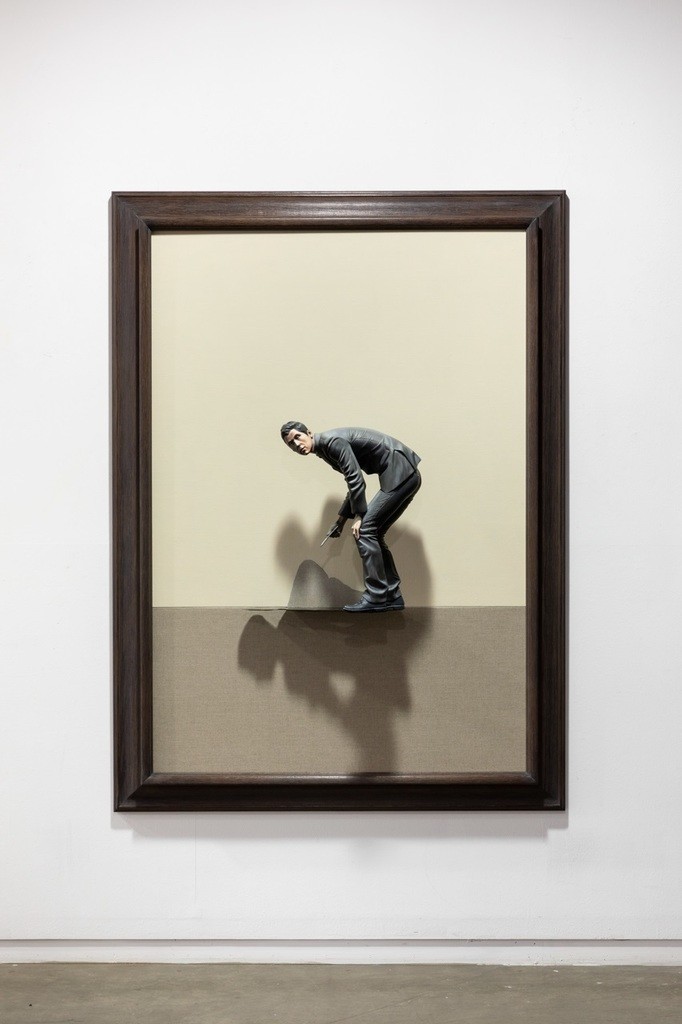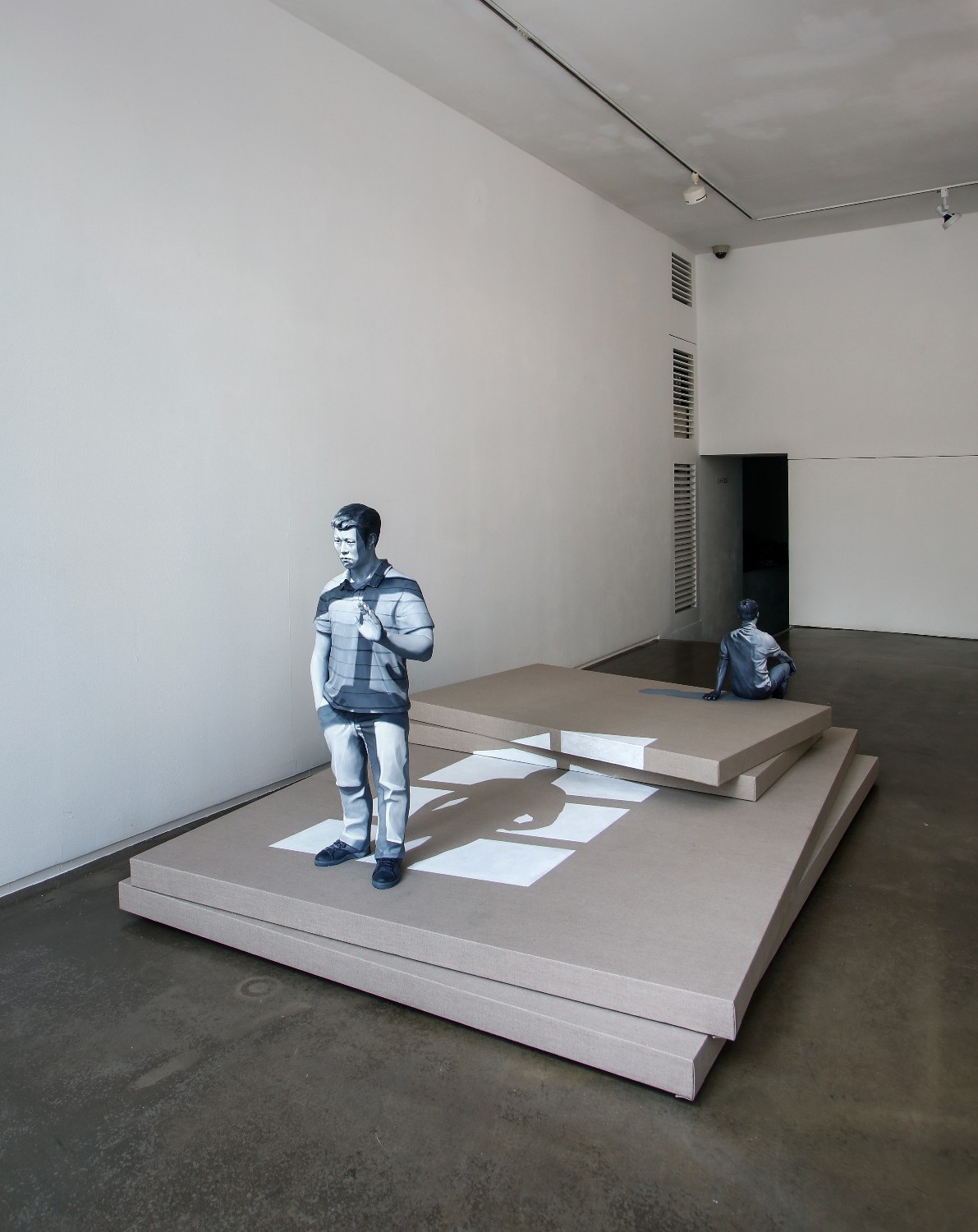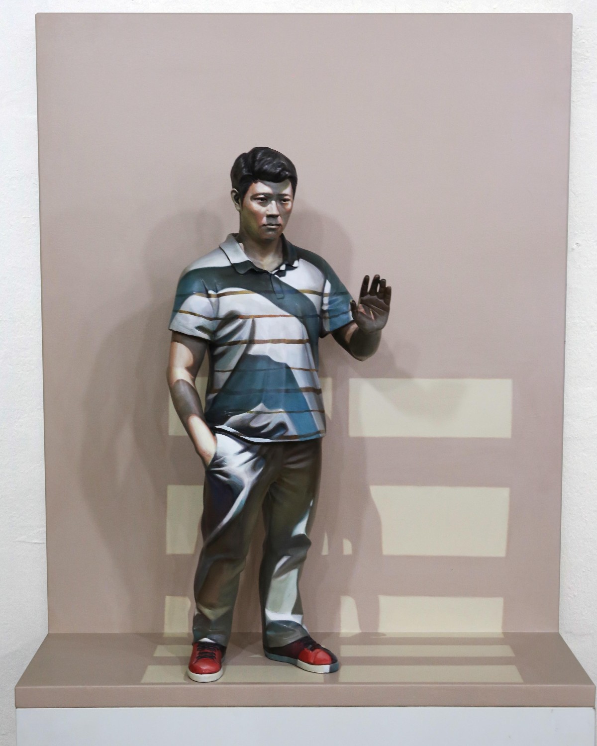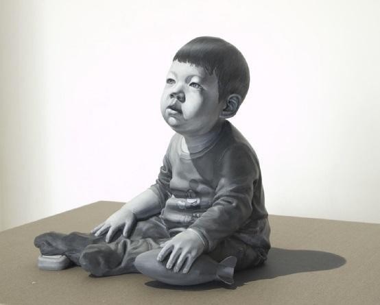 My work is an attempt to capture an instant moment of the moment [刹那, chalna]; especially those moments of enlightenment imbued in my memory. In my work, I tried to embody the imprinted moments formed with psychological altitude, emotional element, a new discovery or an opposing element of experienced. And to have the temporal concept of the “present” in which the circumstances occurred expressed as an artwork, the contrast and coloration extracted from the “present” were transferred on the sculpture of human body. The work has colored contrast with strong shading. Because I believe a shadow of any shape can represent a moment of the time. For example, in a sundial, a shadow points to a single number, and I looked more focused on the shape of the shadow rather than on the number. If we had such an ability to distinguish a shape from similar shapes of shadows to the other, we would have been able to suppose a time by looking at the shape of the shadow I wanted the audience to sympathize and reach the scenes of my memories and to share by looking through the "sculpture of the human body” - it should not be stereoscopically formed but similar and a collection of images - from a circumstance. A scene in memory could be seen in black and white or in color, it is also like a touchable object yet just a plane image. In fact, I do not know clearly. I assume my work process is an act of tracing the memory. I’ve done works in black and white and color, and I’ve also done placing it on the floor or work platform and installed on the wall. Some parts of the work exist as sculpture objects, and they also exist as images. For example, some wrinkles of clothes were carved, when some others were depicted by brush touches.