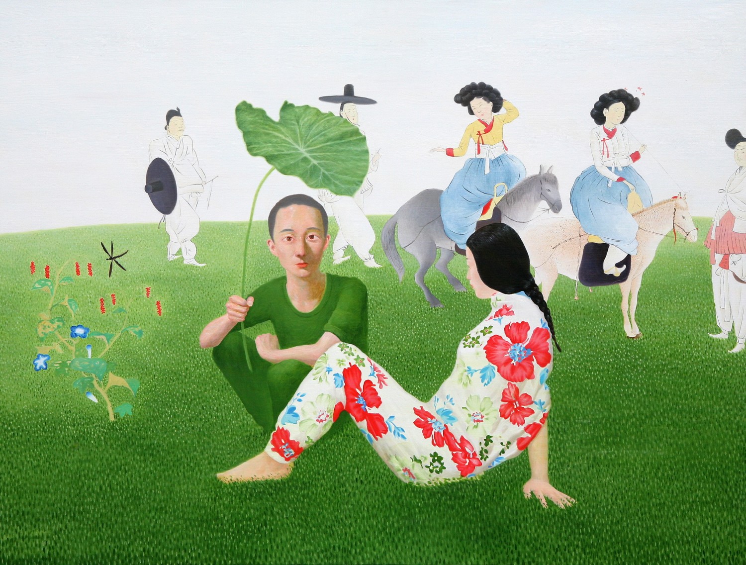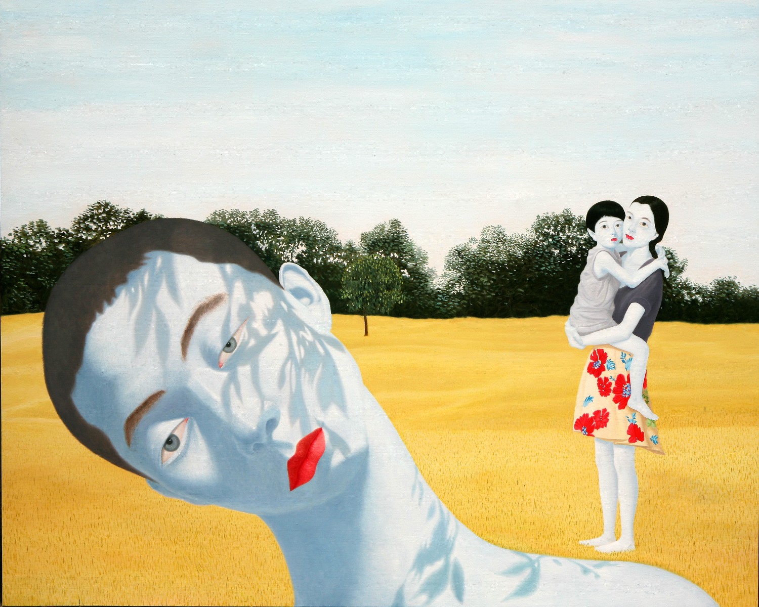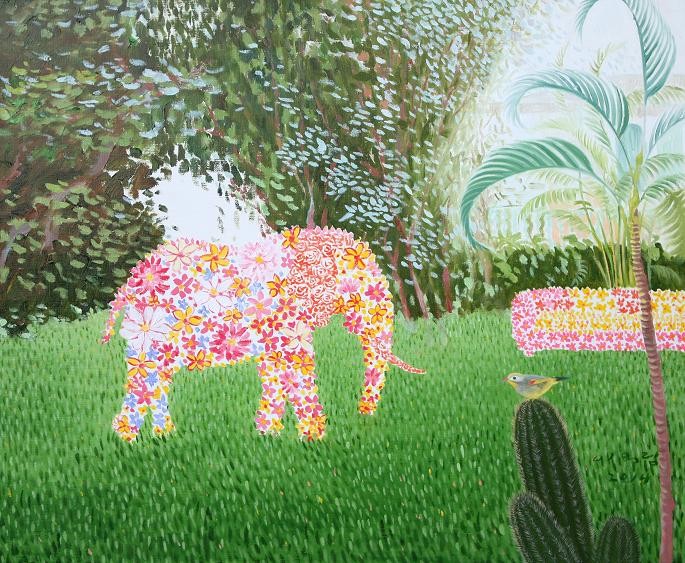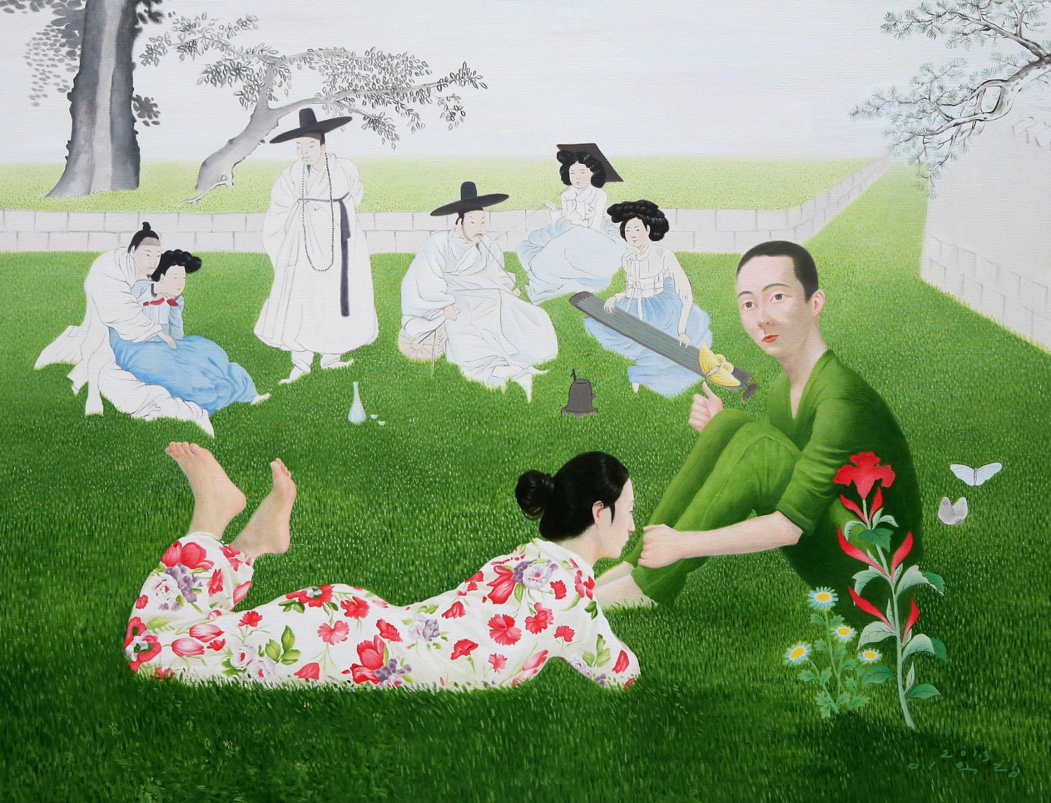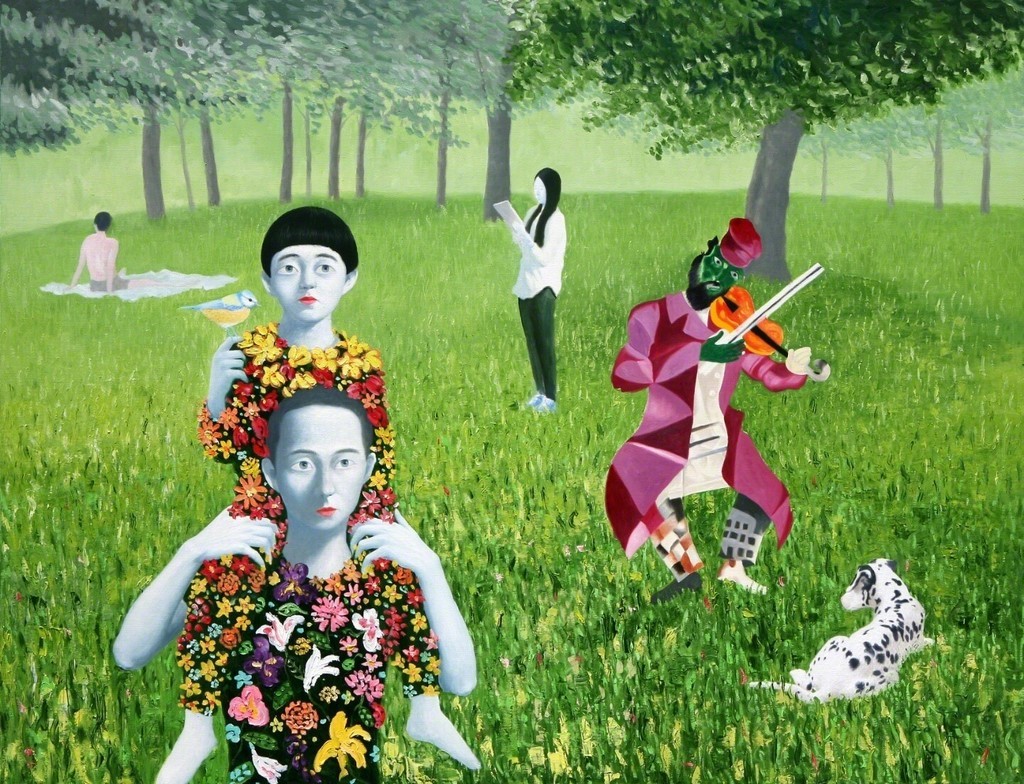 The paintings construct the bridge that connects dream and reality. If we could define the artist's world as such, we will eventually be able to discuss happiness since his works let us restore our rights of being able to dream. Lee’s works have a transcending effect which relieve us from the psychological and the physical pain of reality by guiding us back to reality as well as the world beyond, that is, the dreamy and fantastic world. The special devices in his works, for instance, green meadows like soft cushions, and the surface of calm waters, invokes the serenity that viewers associate with this imagery when they look. This is supported by the fact that most of his recent works makes use of horizontal composition, which brings a sense of happiness based on a mild psychological state. It is natural for people to feel happiness by looking at an endless poppy flower field or yellow rape flower field, but not when looking at the roaring sea. His works come across as unrealistic and dreamy because of some special devices he has put on the canvas such as, unrealistic facial color of white or yellow, and actions like flying across the sky or even lying on the water. As a matter of fact, it is almost impossible to witness these scenes in reality. If they exist, it is caused by the actor’s makeup or a magic trick. Nevertheless, it seems like it is also true that his works are based on reality. If you look at the relationship between characters and the landscape itself, removing the devices that cause non-figurative features such as the pose and motion of the person, you cannot find any reasonable evidence to assert that it is not a realistic landscape. The calming plains, which are filled with tranquil forests, or filled with colorful poppies, and the rape flower fields painted all over in yellow, are enough to make a sense of reality even though they are not drawn with realistic brush strokes. But our expectation of this reality is shifted by adding a person into the work. The artist’s willingness to pull us out from the harsh reality and into the ideal world has come up with this unique device that enforces a sense of the unrealistic. It is obvious, for example, his reference to Marc Chagall's musician or the use of the stationary landscape technique of Paul Signac, but it is quite unique when it comes to the back view of a woman lying on the water with her chin resting on her hands. He seems to be successful at creating a distance from reality through this series of painting devices. The reason why most audiences feel unfamiliar when looking at his works is these painterly devices rather than being lost in the background of characters. Once he gets a sense of distance from reality, he brings the audience to surreal horizons through another device on the canvas. It is revealed through the flying couple holding hands and the curved-bodied man who flies and kisses the woman with bouquet. Another axis supporting Lee’s art world is a so-called sensuality. This aesthetic feeling which is directly related to the enthusiasm of life is sometimes a factor leading to eroticism in his paintings. Take a look at the woman lying on the knees of a man dressed in yellow-green clothing. There is no exchange of perceptive eye contact between the eyes of the out-of-focus man and the woman wearing colorful floral clothes. The woman's gaze, which appears out of focus, also looks at three muscular men standing behind the man. The Dalmatian’s eyes are facing the woman upside down, while the hands and face of the three men are reminiscent of the sculptures face down. The unfocused eyes on the paled face and red lips are pictorial devices that bring out his figures, but these are symbols that signify disconnection rather than communication in his paintings. It is no wonder then, to wish for communication due to the interruption. The artist paradoxically depicts the state of fragmented psychological isolation of people, like feelings of loneliness in a crowd, with extravagant colors. And it seems to restore the right of being able to dream, as the bridge that connects the dream to reality. If we can fully understand his works, we will finally be able to discuss happiness.