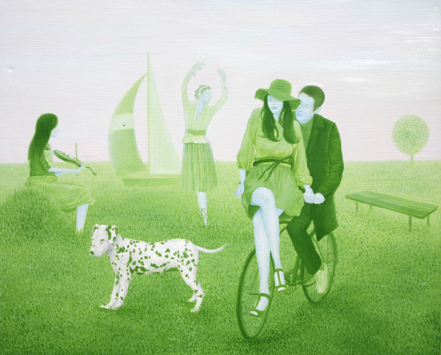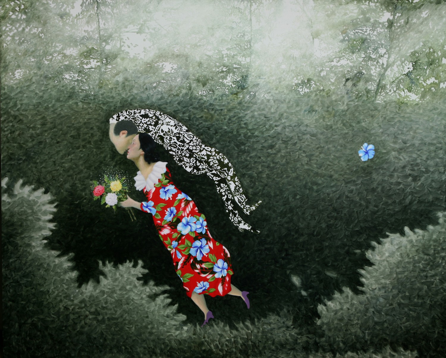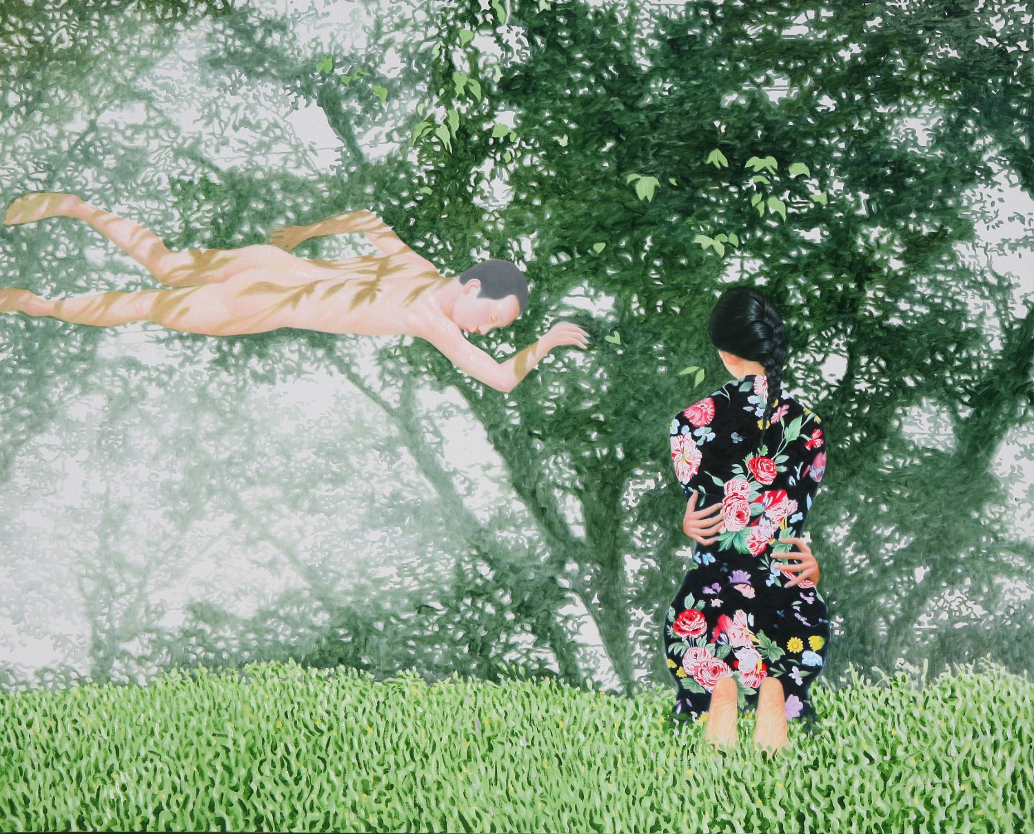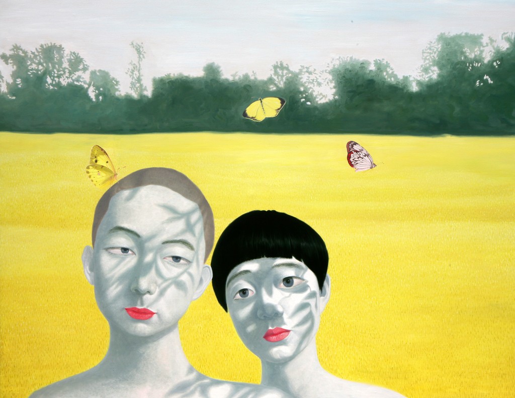 The paintings construct the bridge that connects dream and reality. If we could define the artist's world as such, we will eventually be able to discuss happiness since his works let us restore our rights of being able to dream. Lee’s works have a transcending effect which relieve us from the psychological and the physical pain of reality by guiding us back to reality as well as the world beyond, that is, the dreamy and fantastic world. The special devices in his works, for instance, green meadows like soft cushions, and the surface of calm waters, invokes the serenity that viewers associate with this imagery when they look. This is supported by the fact that most of his recent works makes use of horizontal composition, which brings a sense of happiness based on a mild psychological state. It is natural for people to feel happiness by looking at an endless poppy flower field or yellow rape flower field, but not when looking at the roaring sea. His works come across as unrealistic and dreamy because of some special devices he has put on the canvas such as, unrealistic facial color of white or yellow, and actions like flying across the sky or even lying on the water. As a matter of fact, it is almost impossible to witness these scenes in reality. If they exist, it is caused by the actor’s makeup or a magic trick. Nevertheless, it seems like it is also true that his works are based on reality. If you look at the relationship between characters and the landscape itself, removing the devices that cause non-figurative features such as the pose and motion of the person, you cannot find any reasonable evidence to assert that it is not a realistic landscape. The calming plains, which are filled with tranquil forests, or filled with colorful poppies, and the rape flower fields painted all over in yellow, are enough to make a sense of reality even though they are not drawn with realistic brush strokes. But our expectation of this reality is shifted by adding a person into the work. The artist’s willingness to pull us out from the harsh reality and into the ideal world has come up with this unique device that enforces a sense of the unrealistic. It is obvious, for example, his reference to Marc Chagall's musician or the use of the stationary landscape technique of Paul Signac, but it is quite unique when it comes to the back view of a woman lying on the water with her chin resting on her hands. He seems to be successful at creating a distance from reality through this series of painting devices. The reason why most audiences feel unfamiliar when looking at his works is these painterly devices rather than being lost in the background of characters. Once he gets a sense of distance from reality, he brings the audience to surreal horizons through another device on the canvas. It is revealed through the flying couple holding hands and the curved-bodied man who flies and kisses the woman with bouquet. Another axis supporting Lee’s art world is a so-called sensuality. This aesthetic feeling which is directly related to the enthusiasm of life is sometimes a factor leading to eroticism in his paintings. Take a look at the woman lying on the knees of a man dressed in yellow-green clothing. There is no exchange of perceptive eye contact between the eyes of the out-of-focus man and the woman wearing colorful floral clothes. The woman's gaze, which appears out of focus, also looks at three muscular men standing behind the man. The Dalmatian’s eyes are facing the woman upside down, while the hands and face of the three men are reminiscent of the sculptures face down. The unfocused eyes on the paled face and red lips are pictorial devices that bring out his figures, but these are symbols that signify disconnection rather than communication in his paintings. It is no wonder then, to wish for communication due to the interruption. The artist paradoxically depicts the state of fragmented psychological isolation of people, like feelings of loneliness in a crowd, with extravagant colors. And it seems to restore the right of being able to dream, as the bridge that connects the dream to reality. If we can fully understand his works, we will finally be able to discuss happiness.