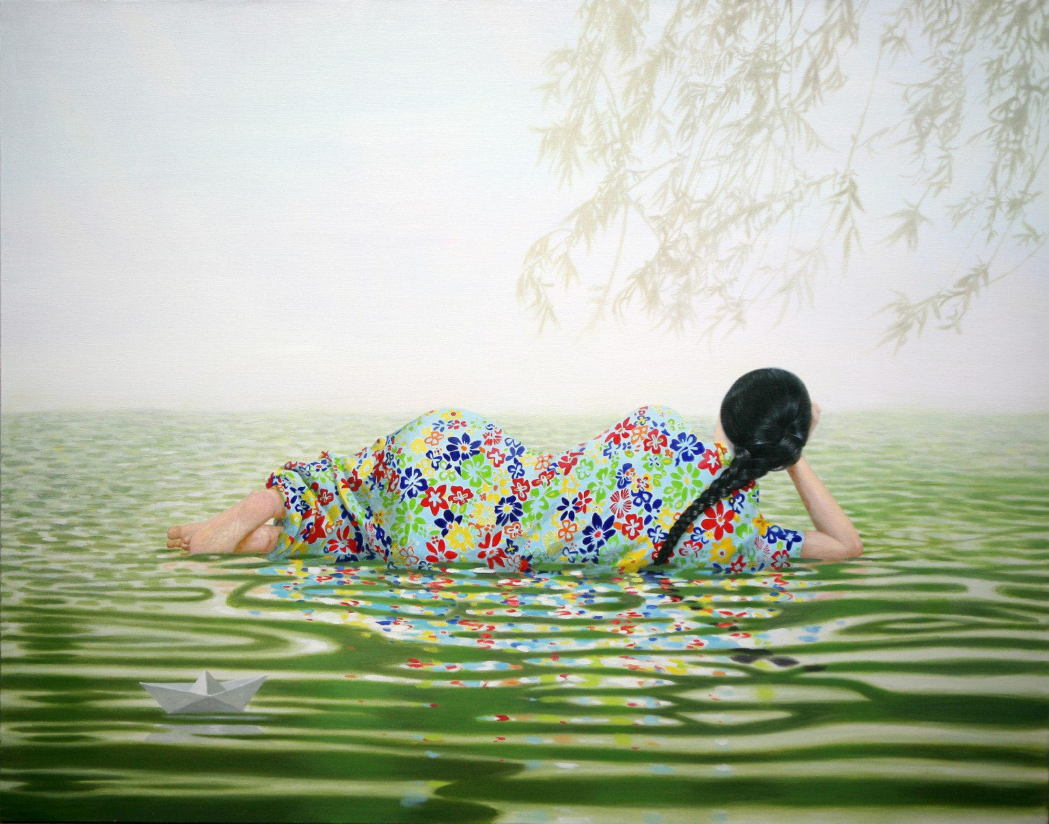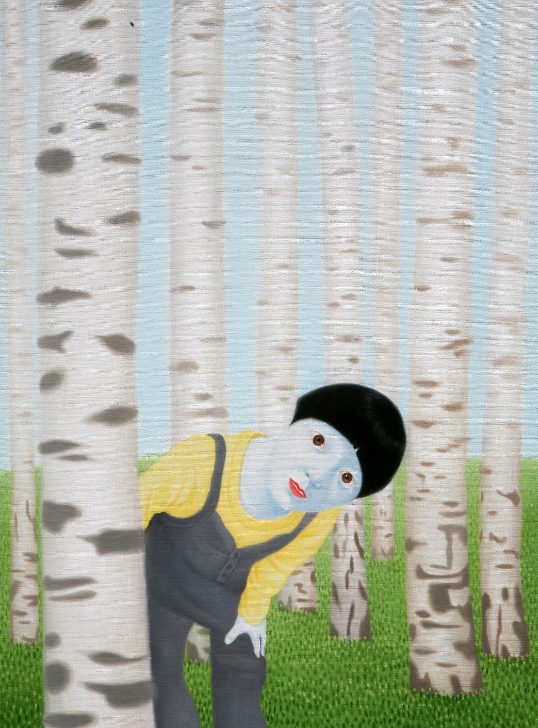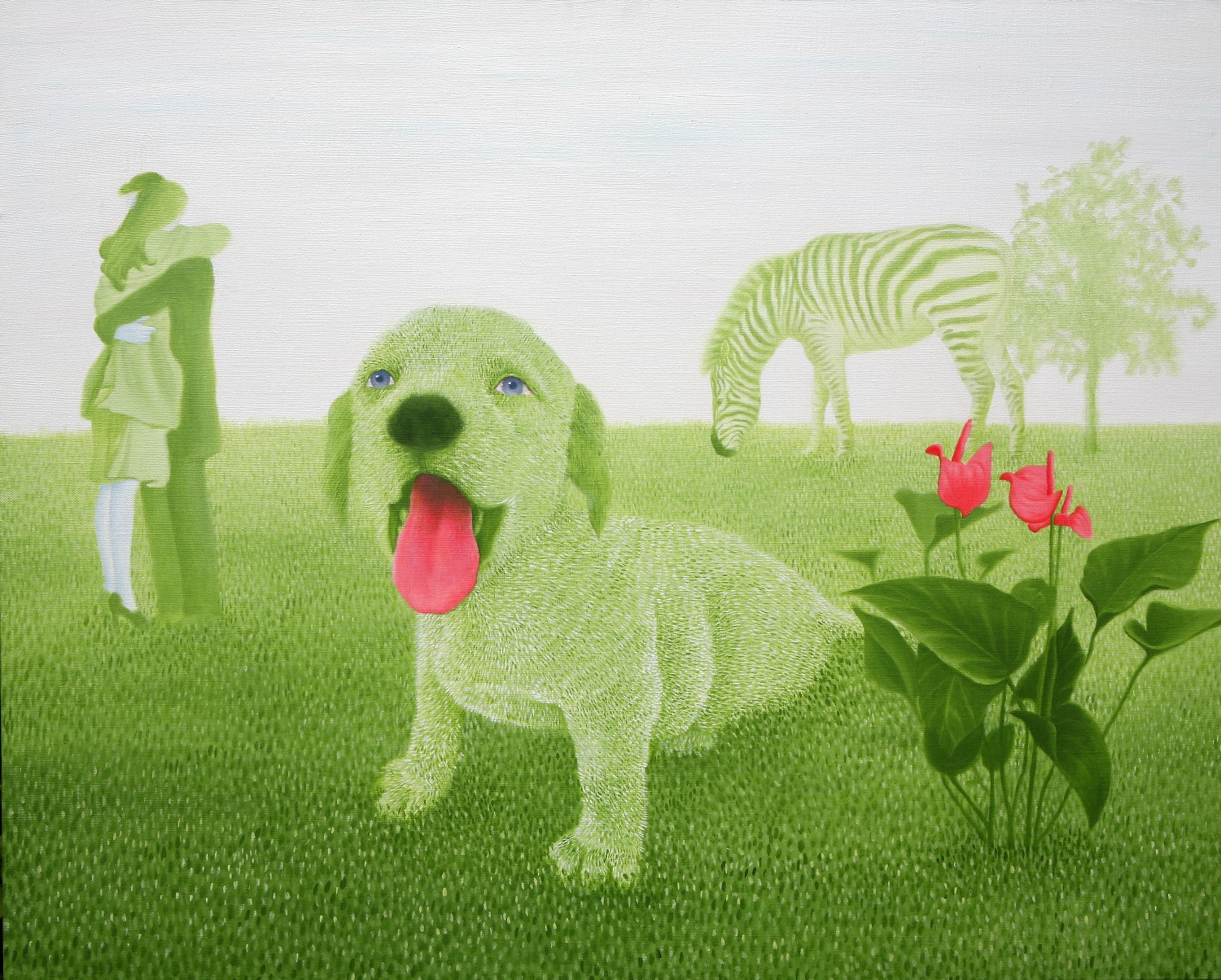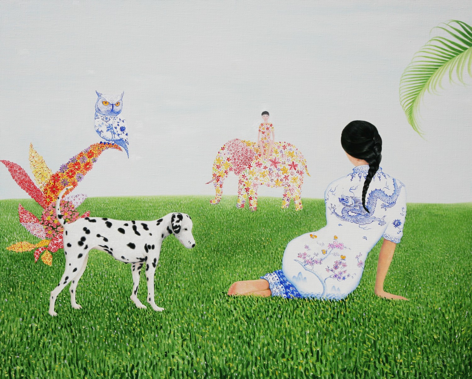 The paintings construct the bridge that connects dream and reality. If we could define the artist's world as such, we will eventually be able to discuss happiness since his works let us restore our rights of being able to dream. Lee’s works have a transcending effect which relieve us from the psychological and the physical pain of reality by guiding us back to reality as well as the world beyond, that is, the dreamy and fantastic world. The special devices in his works, for instance, green meadows like soft cushions, and the surface of calm waters, invokes the serenity that viewers associate with this imagery when they look. This is supported by the fact that most of his recent works makes use of horizontal composition, which brings a sense of happiness based on a mild psychological state. It is natural for people to feel happiness by looking at an endless poppy flower field or yellow rape flower field, but not when looking at the roaring sea. His works come across as unrealistic and dreamy because of some special devices he has put on the canvas such as, unrealistic facial color of white or yellow, and actions like flying across the sky or even lying on the water. As a matter of fact, it is almost impossible to witness these scenes in reality. If they exist, it is caused by the actor’s makeup or a magic trick. Nevertheless, it seems like it is also true that his works are based on reality. If you look at the relationship between characters and the landscape itself, removing the devices that cause non-figurative features such as the pose and motion of the person, you cannot find any reasonable evidence to assert that it is not a realistic landscape. The calming plains, which are filled with tranquil forests, or filled with colorful poppies, and the rape flower fields painted all over in yellow, are enough to make a sense of reality even though they are not drawn with realistic brush strokes. But our expectation of this reality is shifted by adding a person into the work. The artist’s willingness to pull us out from the harsh reality and into the ideal world has come up with this unique device that enforces a sense of the unrealistic. It is obvious, for example, his reference to Marc Chagall's musician or the use of the stationary landscape technique of Paul Signac, but it is quite unique when it comes to the back view of a woman lying on the water with her chin resting on her hands. He seems to be successful at creating a distance from reality through this series of painting devices. The reason why most audiences feel unfamiliar when looking at his works is these painterly devices rather than being lost in the background of characters. Once he gets a sense of distance from reality, he brings the audience to surreal horizons through another device on the canvas. It is revealed through the flying couple holding hands and the curved-bodied man who flies and kisses the woman with bouquet. Another axis supporting Lee’s art world is a so-called sensuality. This aesthetic feeling which is directly related to the enthusiasm of life is sometimes a factor leading to eroticism in his paintings. Take a look at the woman lying on the knees of a man dressed in yellow-green clothing. There is no exchange of perceptive eye contact between the eyes of the out-of-focus man and the woman wearing colorful floral clothes. The woman's gaze, which appears out of focus, also looks at three muscular men standing behind the man. The Dalmatian’s eyes are facing the woman upside down, while the hands and face of the three men are reminiscent of the sculptures face down. The unfocused eyes on the paled face and red lips are pictorial devices that bring out his figures, but these are symbols that signify disconnection rather than communication in his paintings. It is no wonder then, to wish for communication due to the interruption. The artist paradoxically depicts the state of fragmented psychological isolation of people, like feelings of loneliness in a crowd, with extravagant colors. And it seems to restore the right of being able to dream, as the bridge that connects the dream to reality. If we can fully understand his works, we will finally be able to discuss happiness.