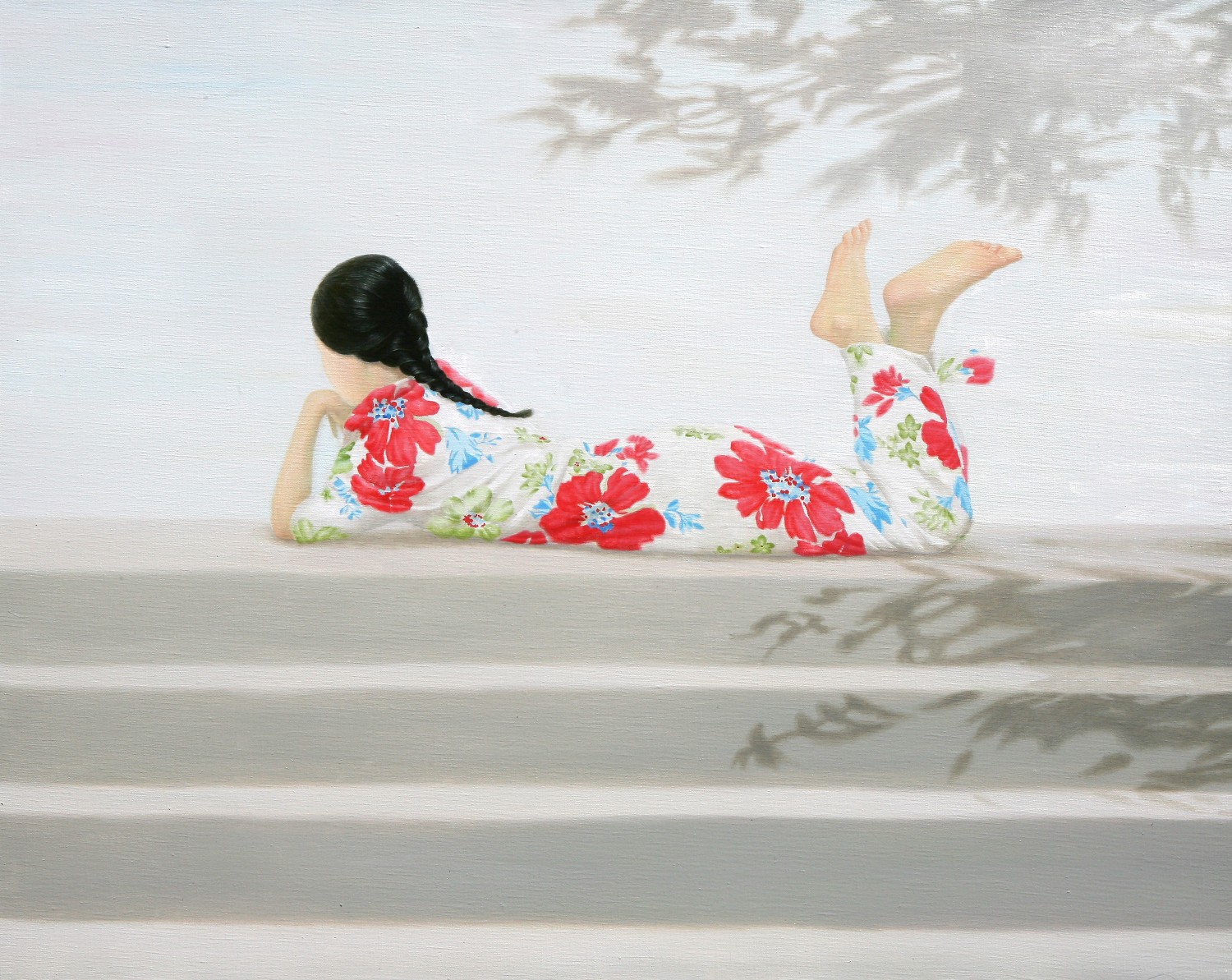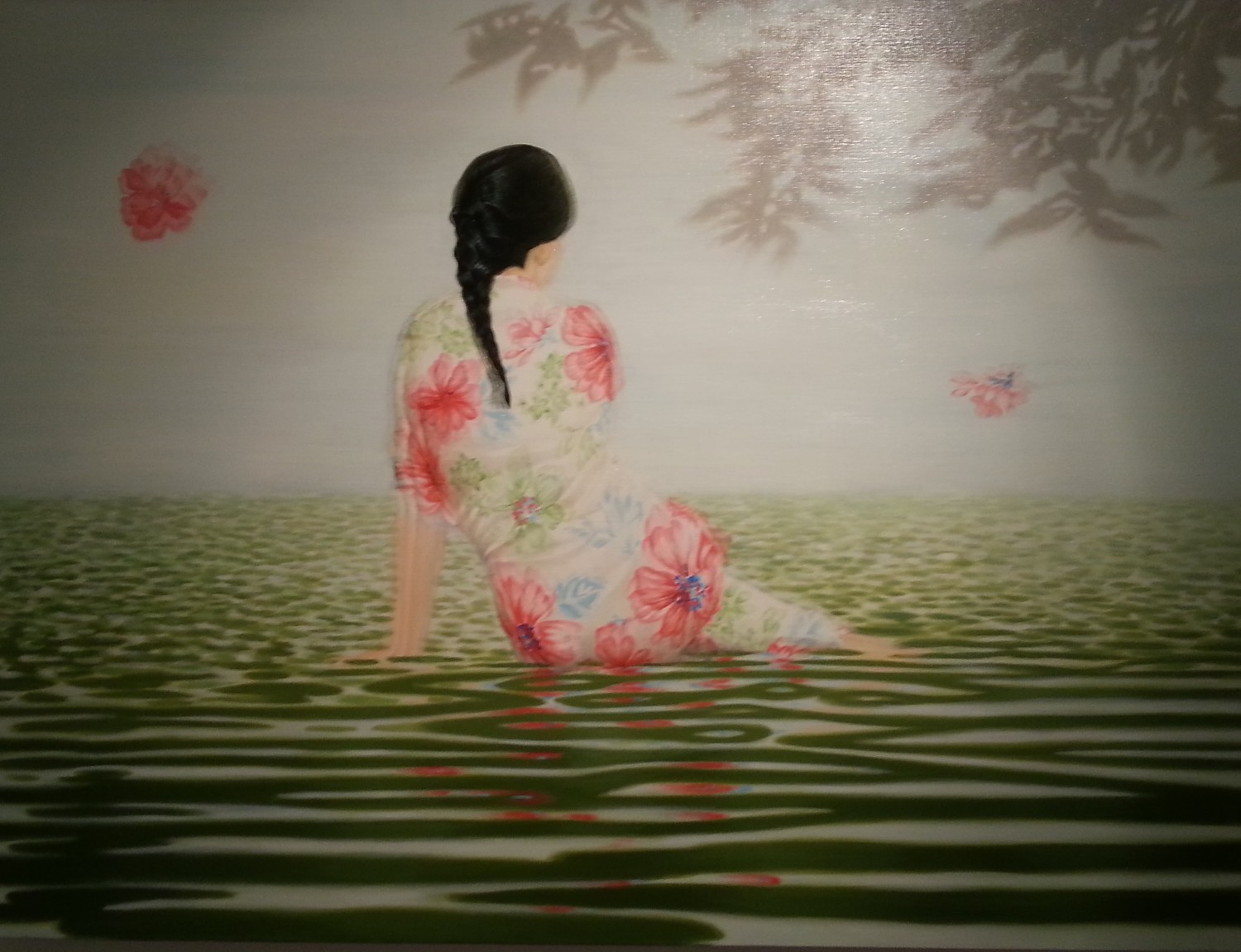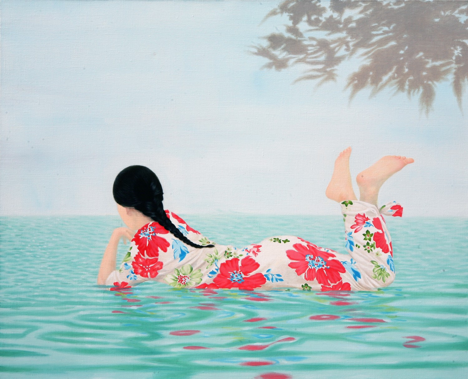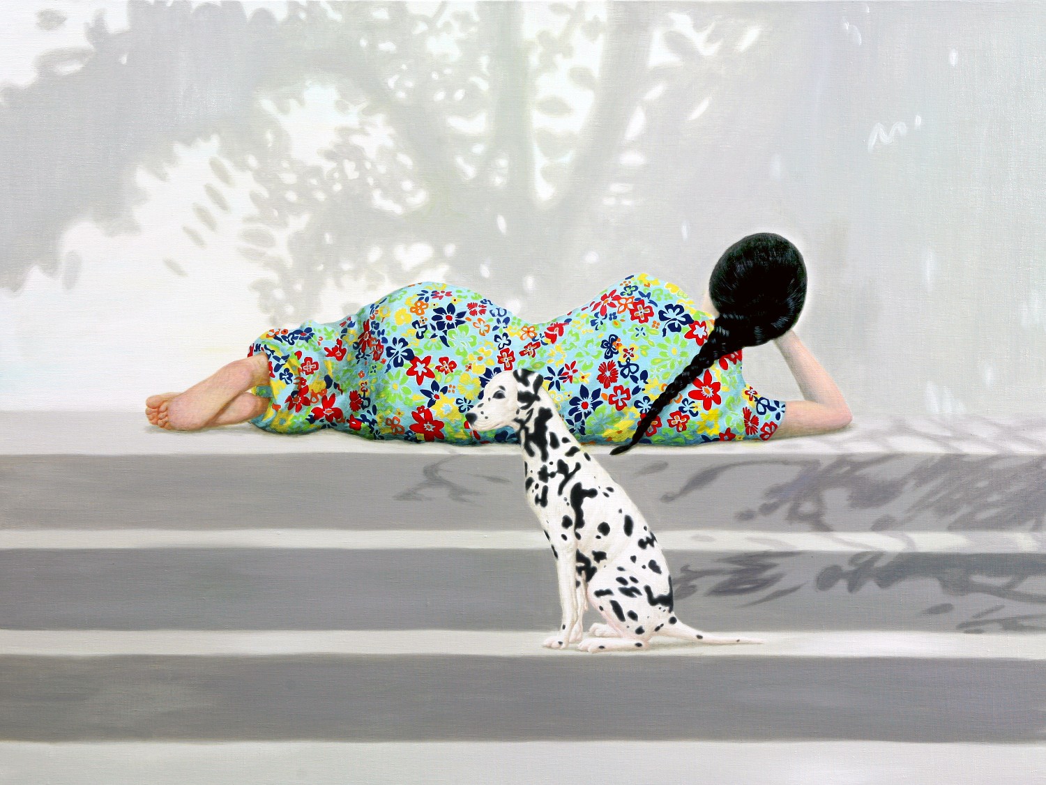 The paintings construct the bridge that connects dream and reality. If we could define the artist's world as such, we will eventually be able to discuss happiness since his works let us restore our rights of being able to dream. Lee’s works have a transcending effect which relieve us from the psychological and the physical pain of reality by guiding us back to reality as well as the world beyond, that is, the dreamy and fantastic world. The special devices in his works, for instance, green meadows like soft cushions, and the surface of calm waters, invokes the serenity that viewers associate with this imagery when they look. This is supported by the fact that most of his recent works makes use of horizontal composition, which brings a sense of happiness based on a mild psychological state. It is natural for people to feel happiness by looking at an endless poppy flower field or yellow rape flower field, but not when looking at the roaring sea. His works come across as unrealistic and dreamy because of some special devices he has put on the canvas such as, unrealistic facial color of white or yellow, and actions like flying across the sky or even lying on the water. As a matter of fact, it is almost impossible to witness these scenes in reality. If they exist, it is caused by the actor’s makeup or a magic trick. Nevertheless, it seems like it is also true that his works are based on reality. If you look at the relationship between characters and the landscape itself, removing the devices that cause non-figurative features such as the pose and motion of the person, you cannot find any reasonable evidence to assert that it is not a realistic landscape. The calming plains, which are filled with tranquil forests, or filled with colorful poppies, and the rape flower fields painted all over in yellow, are enough to make a sense of reality even though they are not drawn with realistic brush strokes. But our expectation of this reality is shifted by adding a person into the work. The artist’s willingness to pull us out from the harsh reality and into the ideal world has come up with this unique device that enforces a sense of the unrealistic. It is obvious, for example, his reference to Marc Chagall's musician or the use of the stationary landscape technique of Paul Signac, but it is quite unique when it comes to the back view of a woman lying on the water with her chin resting on her hands. He seems to be successful at creating a distance from reality through this series of painting devices. The reason why most audiences feel unfamiliar when looking at his works is these painterly devices rather than being lost in the background of characters. Once he gets a sense of distance from reality, he brings the audience to surreal horizons through another device on the canvas. It is revealed through the flying couple holding hands and the curved-bodied man who flies and kisses the woman with bouquet. Another axis supporting Lee’s art world is a so-called sensuality. This aesthetic feeling which is directly related to the enthusiasm of life is sometimes a factor leading to eroticism in his paintings. Take a look at the woman lying on the knees of a man dressed in yellow-green clothing. There is no exchange of perceptive eye contact between the eyes of the out-of-focus man and the woman wearing colorful floral clothes. The woman's gaze, which appears out of focus, also looks at three muscular men standing behind the man. The Dalmatian’s eyes are facing the woman upside down, while the hands and face of the three men are reminiscent of the sculptures face down. The unfocused eyes on the paled face and red lips are pictorial devices that bring out his figures, but these are symbols that signify disconnection rather than communication in his paintings. It is no wonder then, to wish for communication due to the interruption. The artist paradoxically depicts the state of fragmented psychological isolation of people, like feelings of loneliness in a crowd, with extravagant colors. And it seems to restore the right of being able to dream, as the bridge that connects the dream to reality. If we can fully understand his works, we will finally be able to discuss happiness.