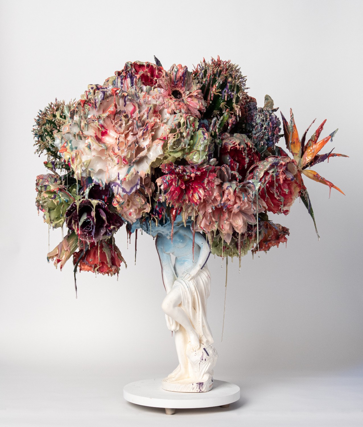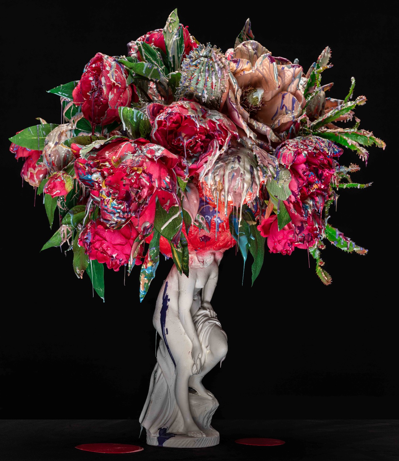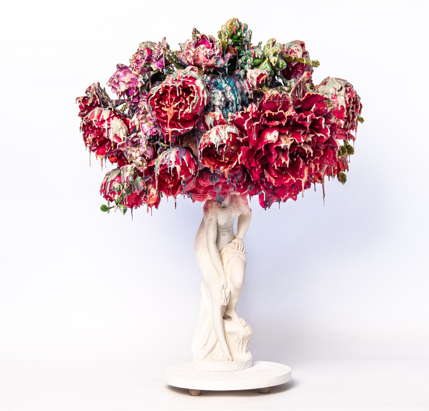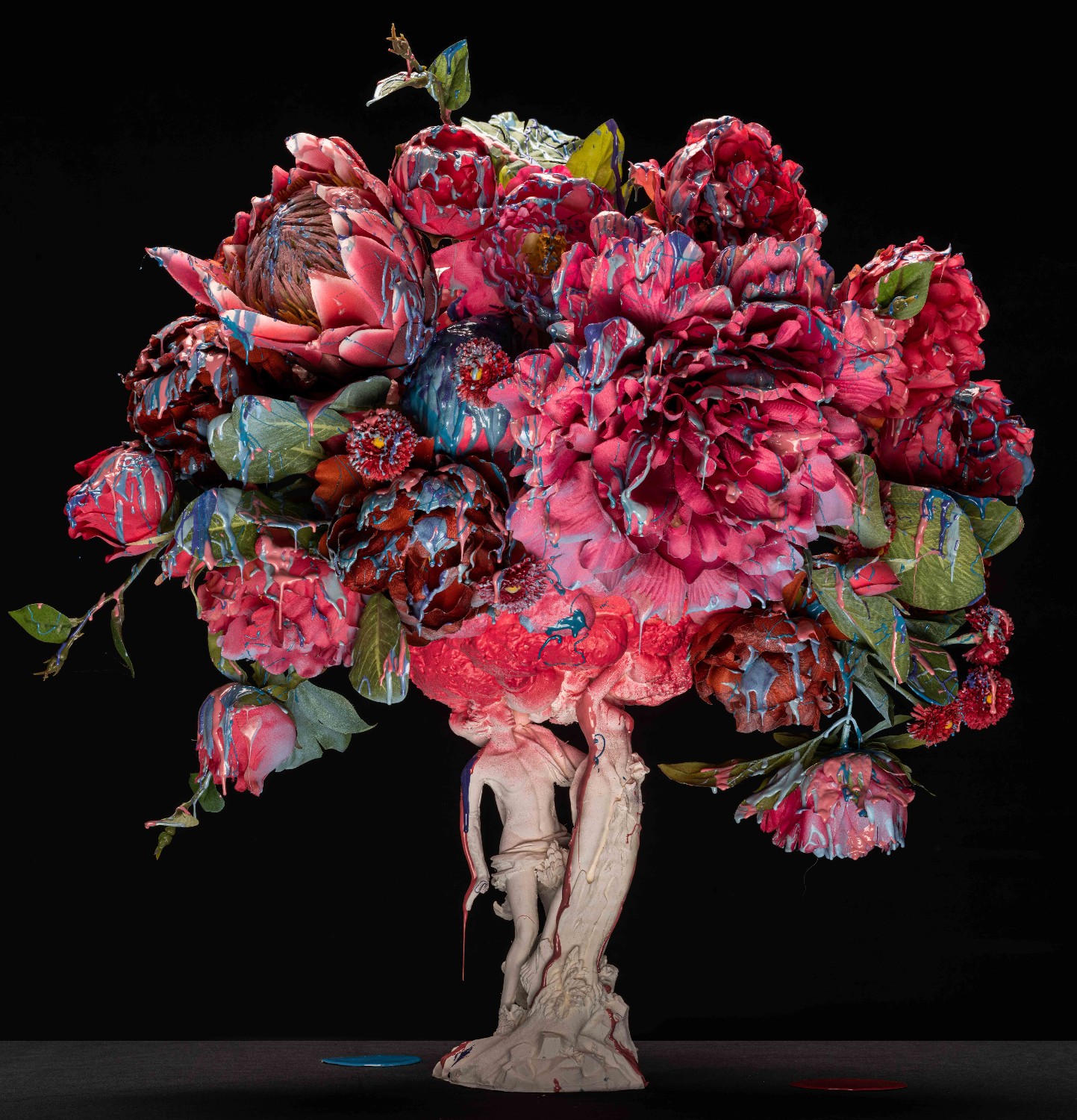 Works of Hyojin Park resemble a sad monster. Sculptures supporting the base - such as Nike, David, Poseidon and Madonna - are the human figures or the humanlike god/goddess in mythology representing the paradise of humans. The white and blue porcelain represent the highest level of cultural products. Whereas the realistic paradise sustains the base, the splendid flowers in the upper part are the products of higher desire and show the untouchable and unattainable paradise. Colourful pigments pour out the crazy feast of flowers in full bloom splendidly in all season and in all times. However these bunches of flowers that burst out desire fiercely and breathlessly are fake flowers, ceased in the most impressive moment and show nothing but castrated desire. As the sculptures and white/blue porcelain are not authentic originals but reproduced imitations, the reality itself that we dream may not be real. Also although the idealization has the most brilliant image, it has been castrated and killed. The colours burst out weighed down like shedding blood and dropping tears. Hyojin Park’s works contains the sorrow gushing from both a transparent desire and a castrated desire. Her works crosses the best line between extreme beauties and reflects the monster’s eventual death from the unattainable desires. Above the elegance of the quiet pure white porcelain and the sculptures pursuing the best line of extreme beauty, the impressive flowers do not forget beauty nor wither, they are able to show the paradise contained within themselves even without exuding a scent. The thirst of the heartless youth is for the forgotten paradise. We already know that our desires can never be attained, and so our thirst for the failed paradise does not reduce. Redder than warm blood, brighter than gold, the glamorous colours of the flowers pitifully exudes sadness. Through the paint the perfect reality of the sculptures meets the unattainable paradise. Combined with the most beautiful form it has become a beautiful yet grotesque monster.