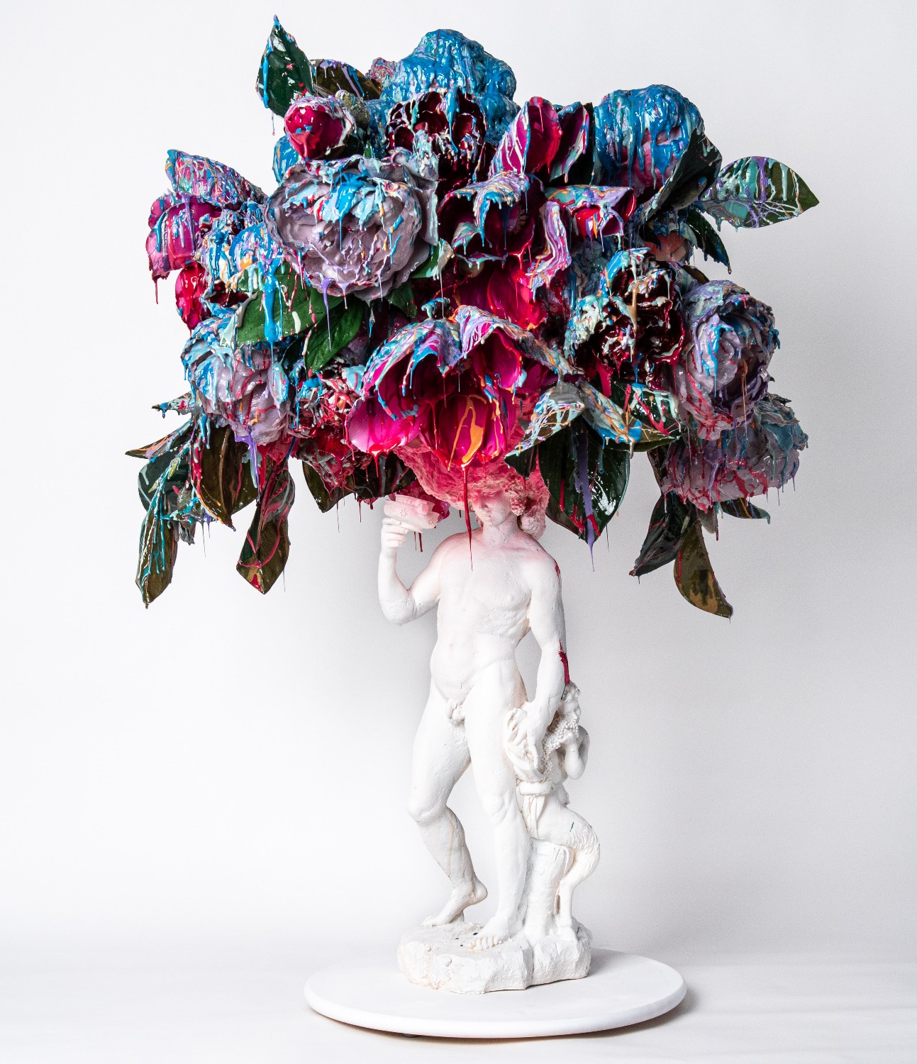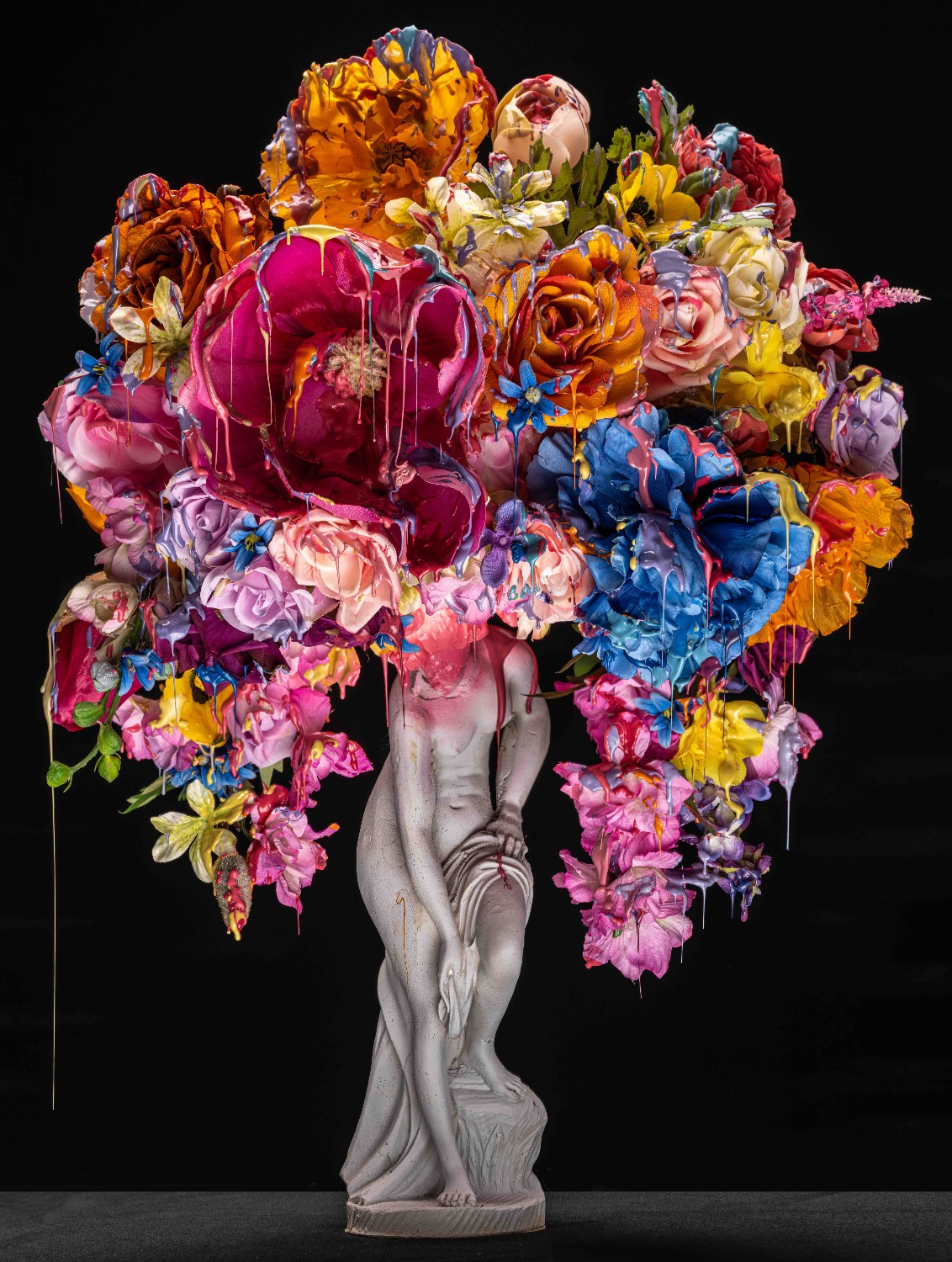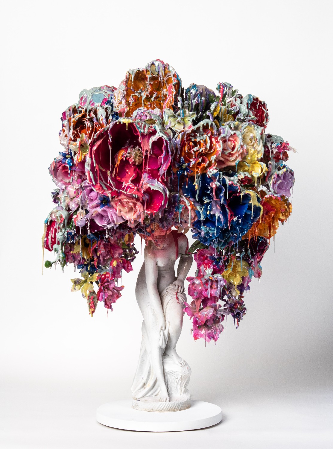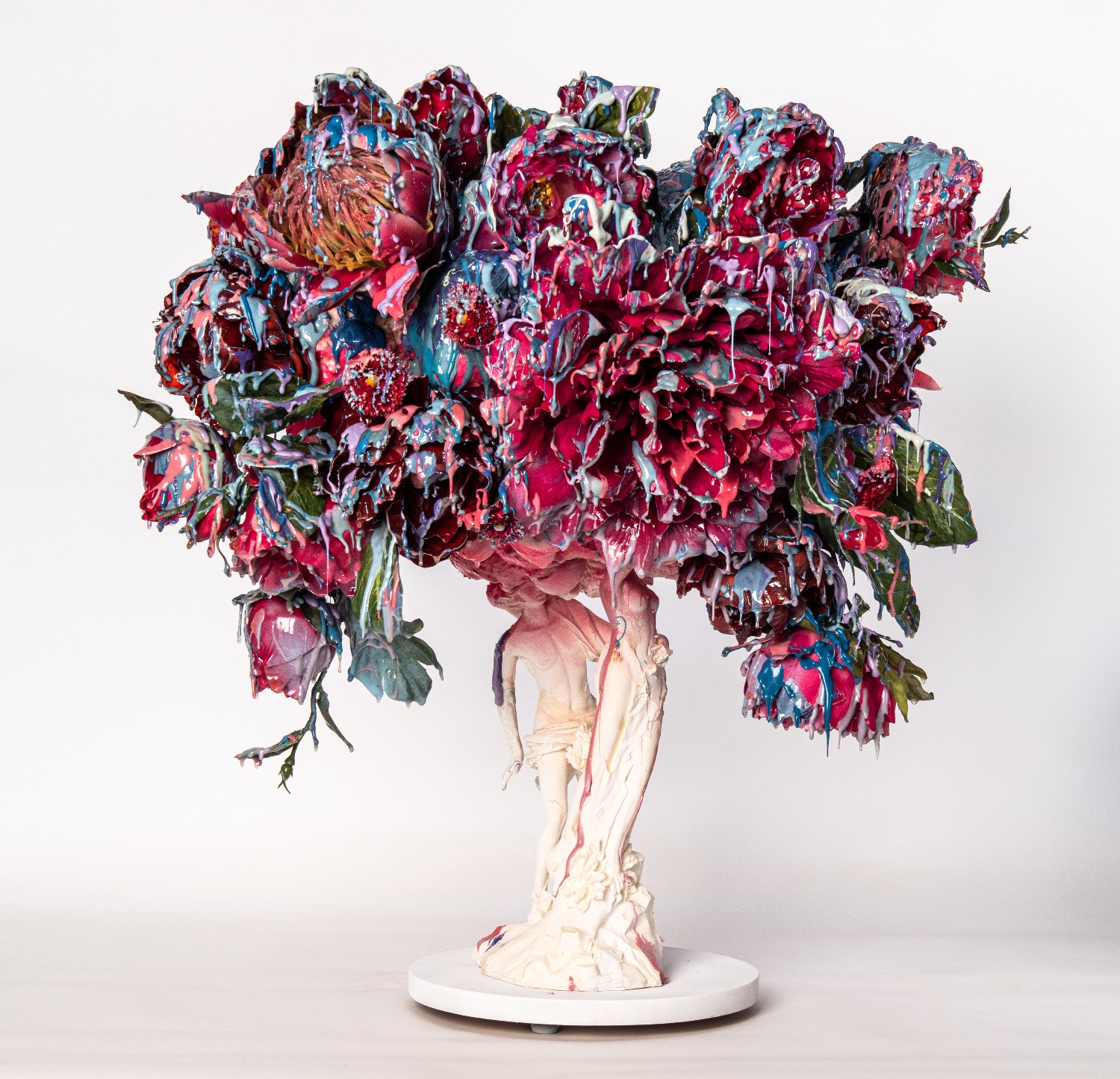 Works of Hyojin Park resemble a sad monster. Sculptures supporting the base - such as Nike, David, Poseidon and Madonna - are the human figures or the humanlike god/goddess in mythology representing the paradise of humans. The white and blue porcelain represent the highest level of cultural products. Whereas the realistic paradise sustains the base, the splendid flowers in the upper part are the products of higher desire and show the untouchable and unattainable paradise. Colourful pigments pour out the crazy feast of flowers in full bloom splendidly in all season and in all times. However these bunches of flowers that burst out desire fiercely and breathlessly are fake flowers, ceased in the most impressive moment and show nothing but castrated desire. As the sculptures and white/blue porcelain are not authentic originals but reproduced imitations, the reality itself that we dream may not be real. Also although the idealization has the most brilliant image, it has been castrated and killed. The colours burst out weighed down like shedding blood and dropping tears. Hyojin Park’s works contains the sorrow gushing from both a transparent desire and a castrated desire. Her works crosses the best line between extreme beauties and reflects the monster’s eventual death from the unattainable desires. Above the elegance of the quiet pure white porcelain and the sculptures pursuing the best line of extreme beauty, the impressive flowers do not forget beauty nor wither, they are able to show the paradise contained within themselves even without exuding a scent. The thirst of the heartless youth is for the forgotten paradise. We already know that our desires can never be attained, and so our thirst for the failed paradise does not reduce. Redder than warm blood, brighter than gold, the glamorous colours of the flowers pitifully exudes sadness. Through the paint the perfect reality of the sculptures meets the unattainable paradise. Combined with the most beautiful form it has become a beautiful yet grotesque monster.