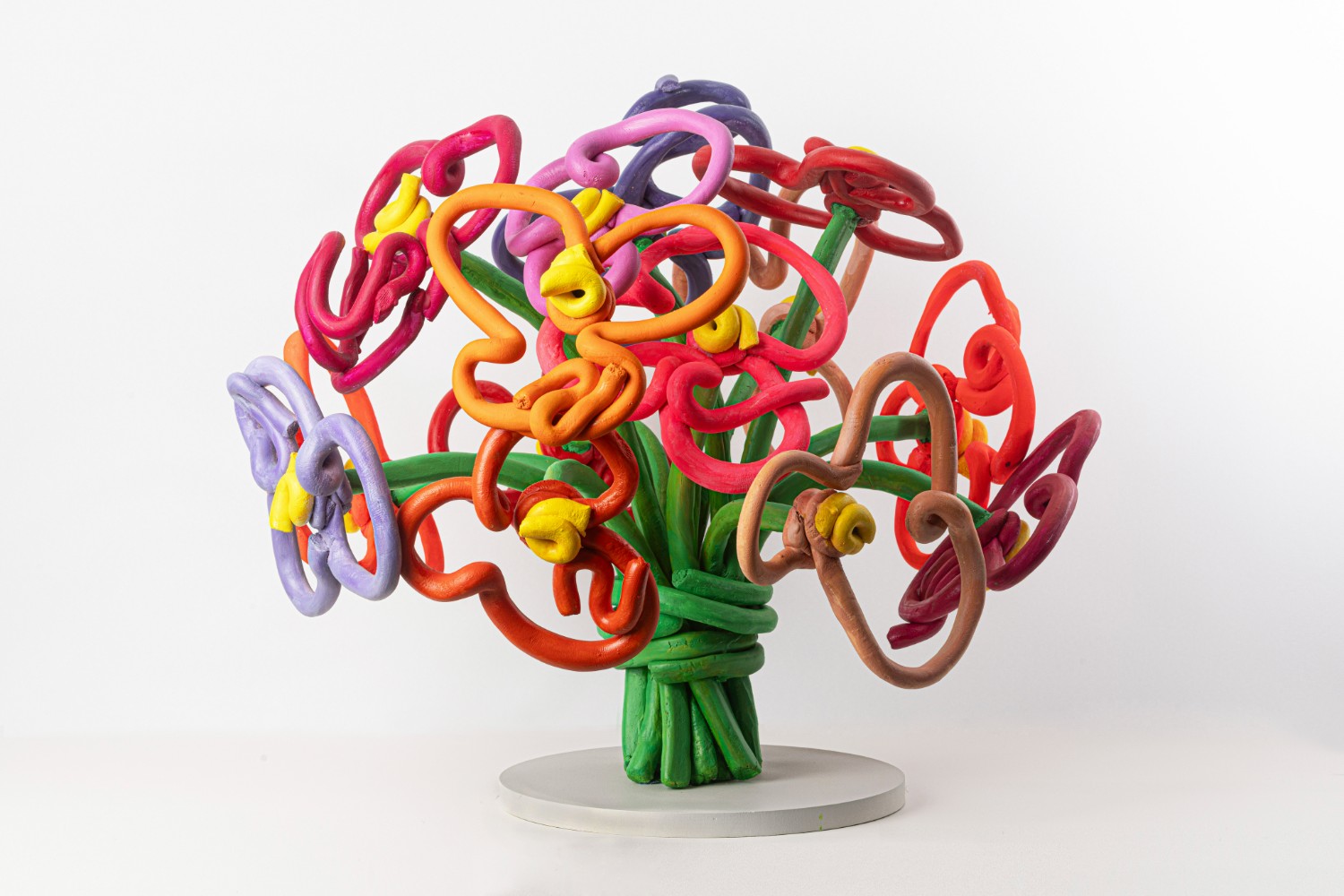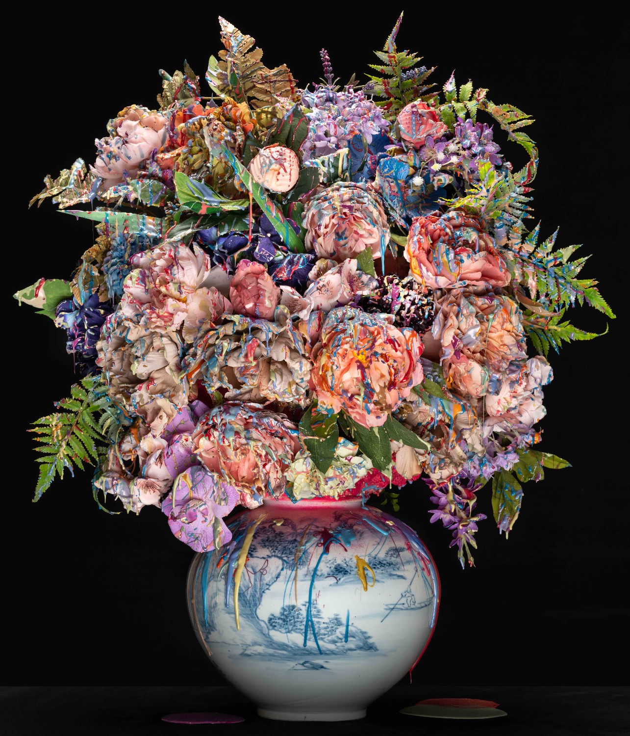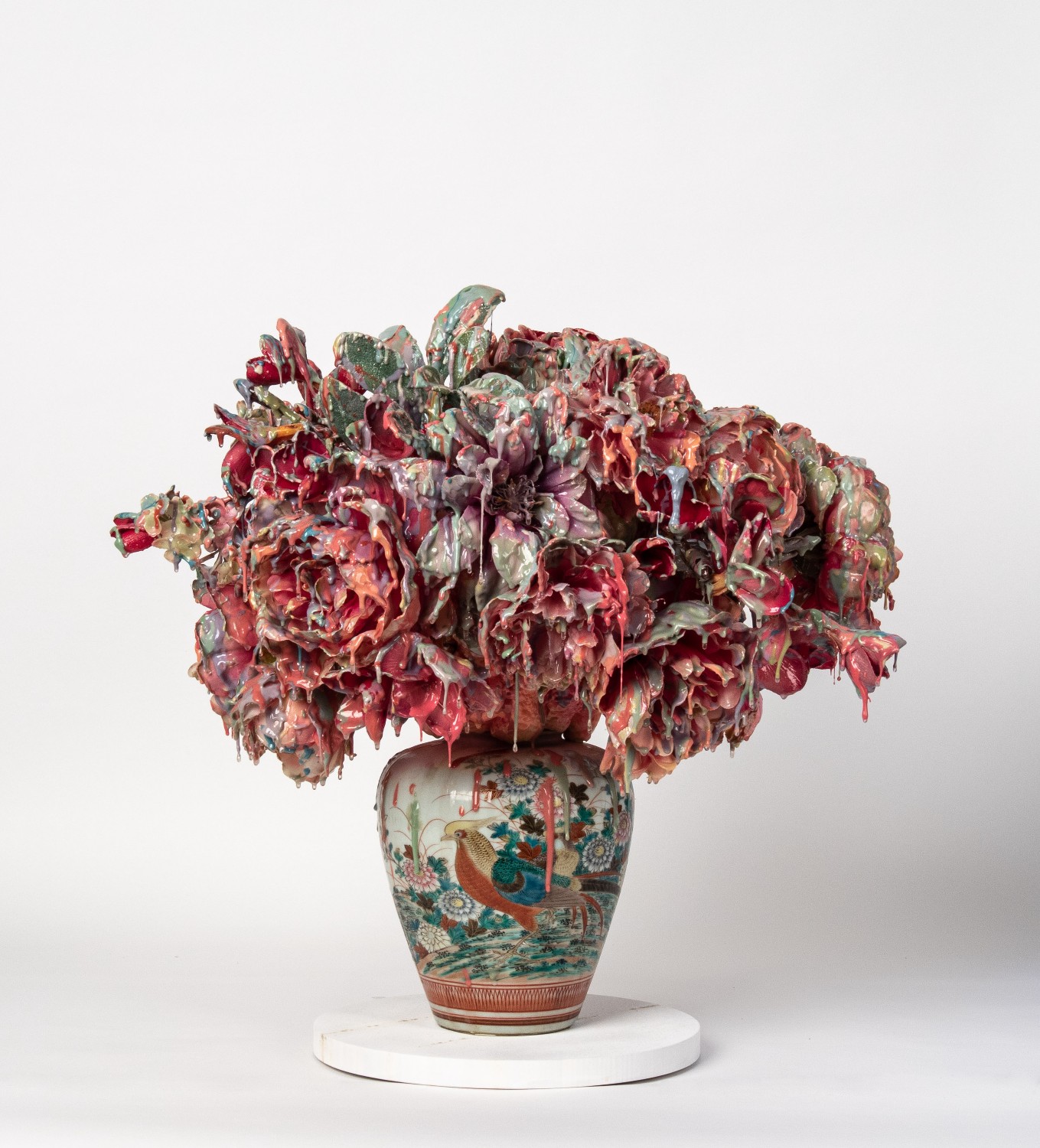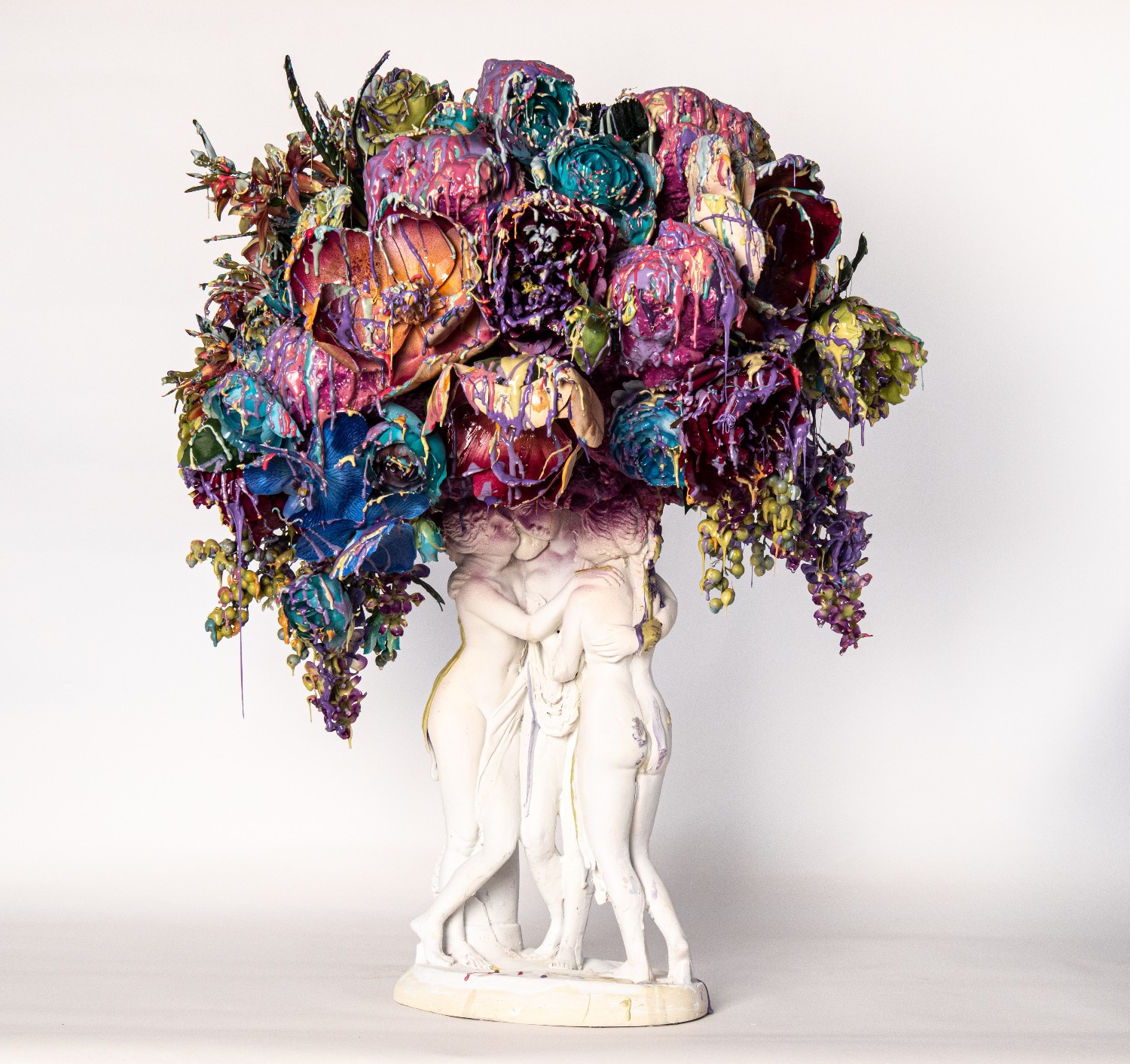 Works of Hyojin Park resemble a sad monster. Sculptures supporting the base - such as Nike, David, Poseidon and Madonna - are the human figures or the humanlike god/goddess in mythology representing the paradise of humans. The white and blue porcelain represent the highest level of cultural products. Whereas the realistic paradise sustains the base, the splendid flowers in the upper part are the products of higher desire and show the untouchable and unattainable paradise. Colourful pigments pour out the crazy feast of flowers in full bloom splendidly in all season and in all times. However these bunches of flowers that burst out desire fiercely and breathlessly are fake flowers, ceased in the most impressive moment and show nothing but castrated desire. As the sculptures and white/blue porcelain are not authentic originals but reproduced imitations, the reality itself that we dream may not be real. Also although the idealization has the most brilliant image, it has been castrated and killed. The colours burst out weighed down like shedding blood and dropping tears. Hyojin Park’s works contains the sorrow gushing from both a transparent desire and a castrated desire. Her works crosses the best line between extreme beauties and reflects the monster’s eventual death from the unattainable desires. Above the elegance of the quiet pure white porcelain and the sculptures pursuing the best line of extreme beauty, the impressive flowers do not forget beauty nor wither, they are able to show the paradise contained within themselves even without exuding a scent. The thirst of the heartless youth is for the forgotten paradise. We already know that our desires can never be attained, and so our thirst for the failed paradise does not reduce. Redder than warm blood, brighter than gold, the glamorous colours of the flowers pitifully exudes sadness. Through the paint the perfect reality of the sculptures meets the unattainable paradise. Combined with the most beautiful form it has become a beautiful yet grotesque monster.