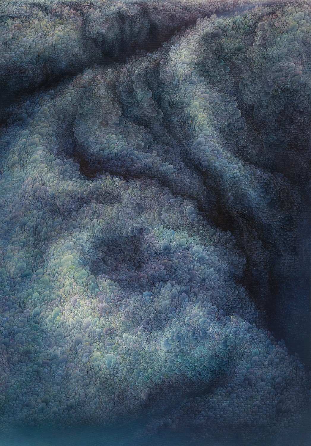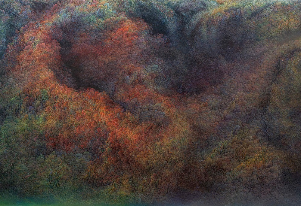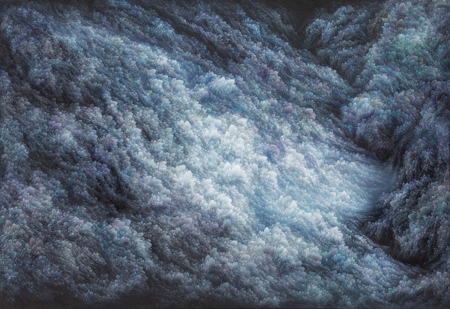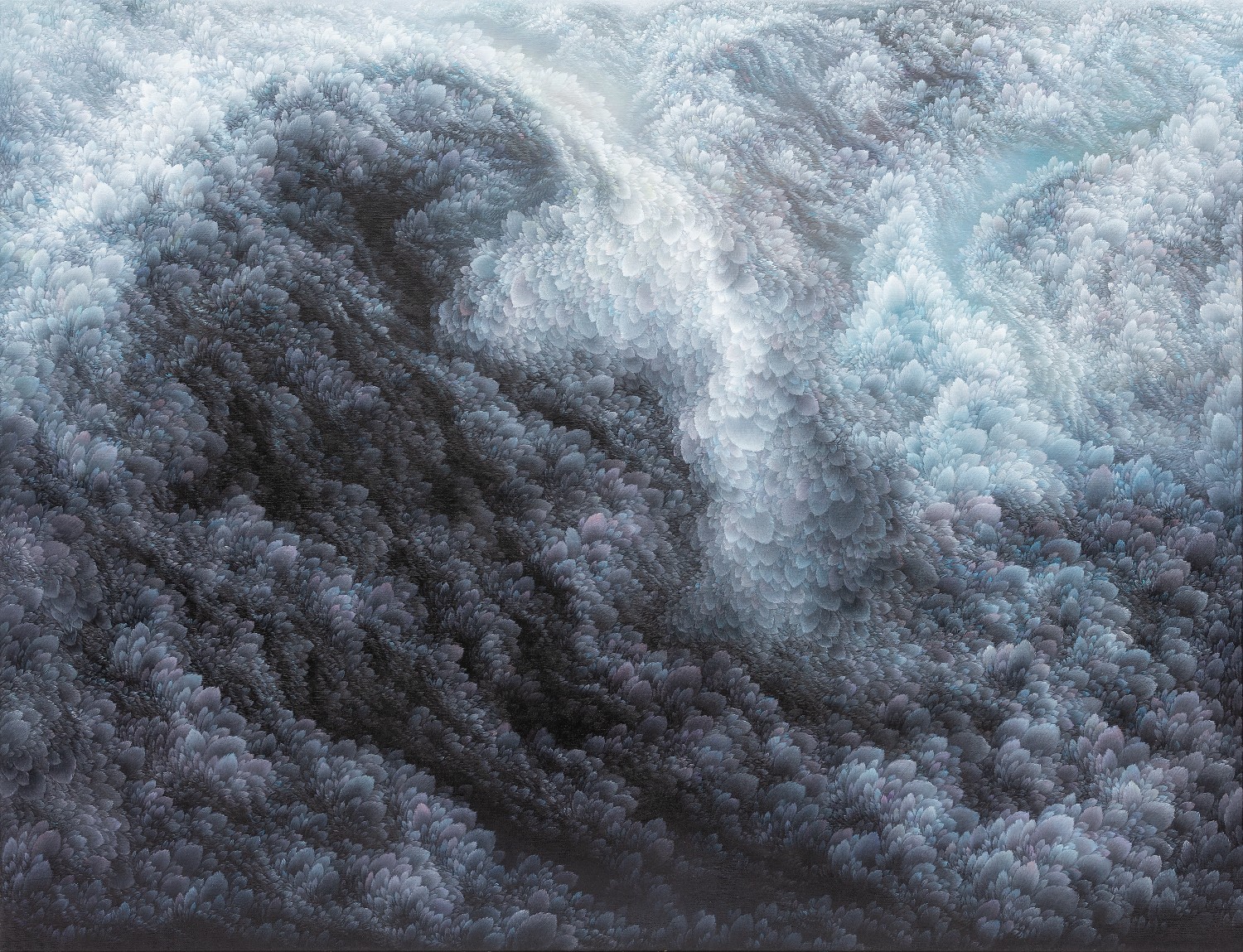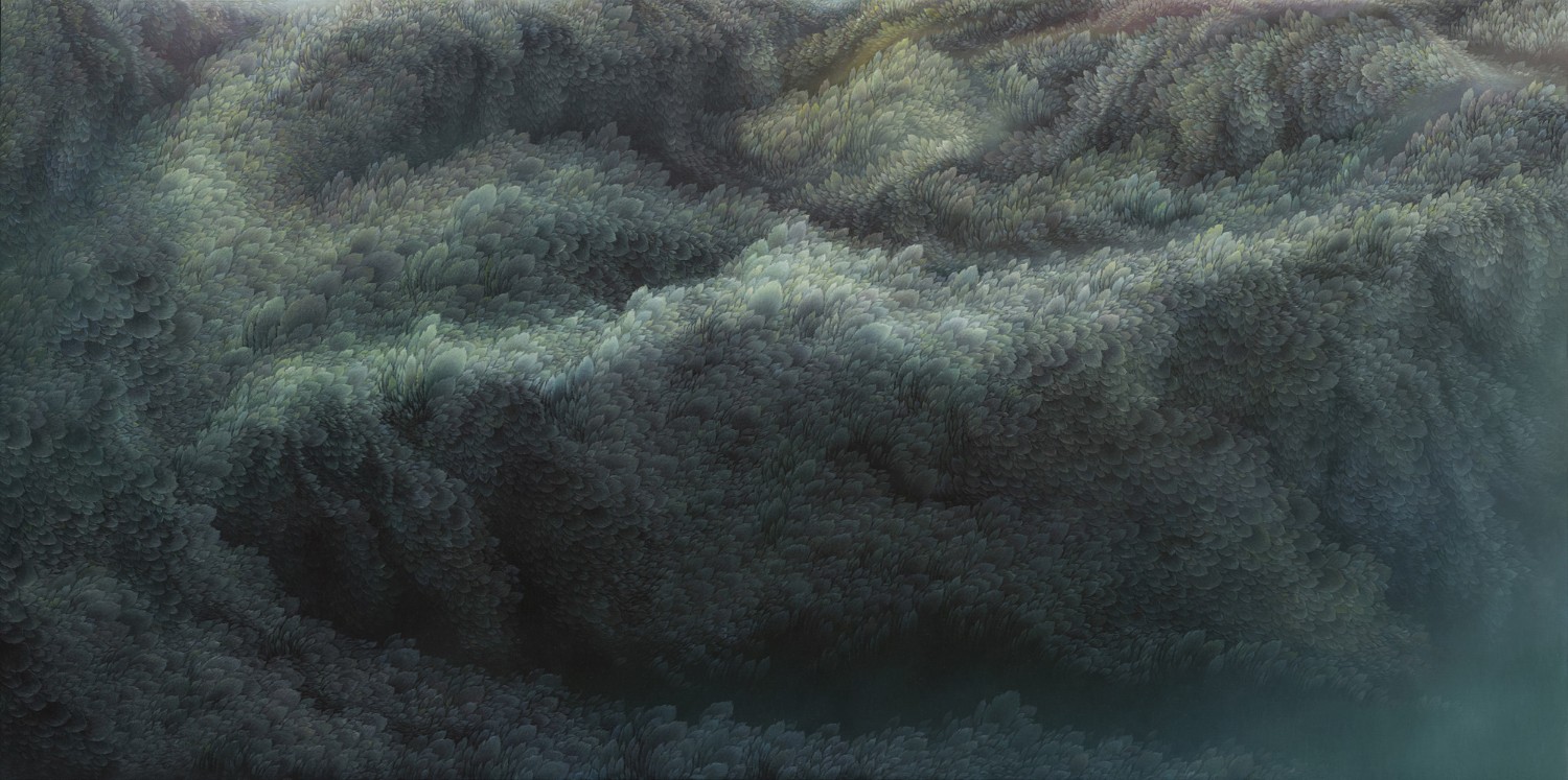 While refusing the use of a fixed viewpoint, artist Jinwook Yeom expresses her intention of rejection in her series of forest-painting. In her painting, brush strokes are visualized in monochrome patterns, and the prevalent monochrome images structure the canvas. The gaze moves along the monotone fluently and dynamically. Thus you can read the images of the forest-painting at your will from the sky to the earth or from top to bottom. The tone fading from the mountain top to the ridges receding endlessly is flowing. The artist replaces the nature of painting that is essentially executed on the flat surface with the structure of the forest, and adjusts it in dark tone. Such structure of the canvas as hers tends to surpass landscape painting as a modern and contemporary genre and to be disparate from local landscape painting at home and abroad. The canvas structure exclusively built up with colors and brush strokes is featured in dark or bright monotone, rendering the structure of the forest-painting diverse. Let us read the painting. The center of the canvas splitting left and right and stretching out. The image winding across the canvas from the left top toward the right bottom. Dark sides beginning from the bottom getting slowly brightened through layering. Dark sides of the bottom flowing into the darkness along the free-ranging line. Contemplating the structure of the forest-painting is also dynamic as well as unrestricted. It is not about rejecting the one-dimensional quality of painting but about how to read the image of the forest. You can freely follow the images structured on the large rectangular canvas ―extending out across the canvas like erupting volcanoes, or extending from side to side along the rainbow rising from the top right side, or crossing the upper part of the canvas and extending to the left and the right. The images even happen to disappear out of the canvas.