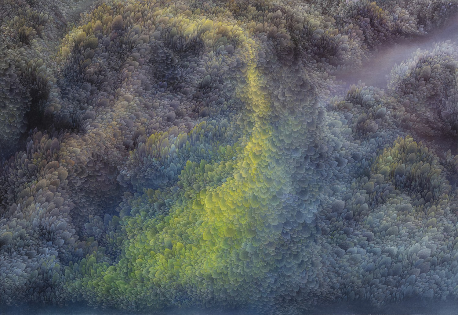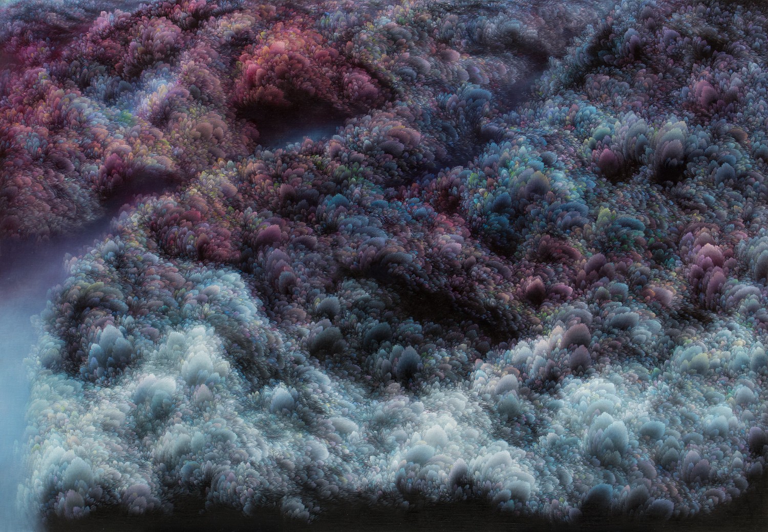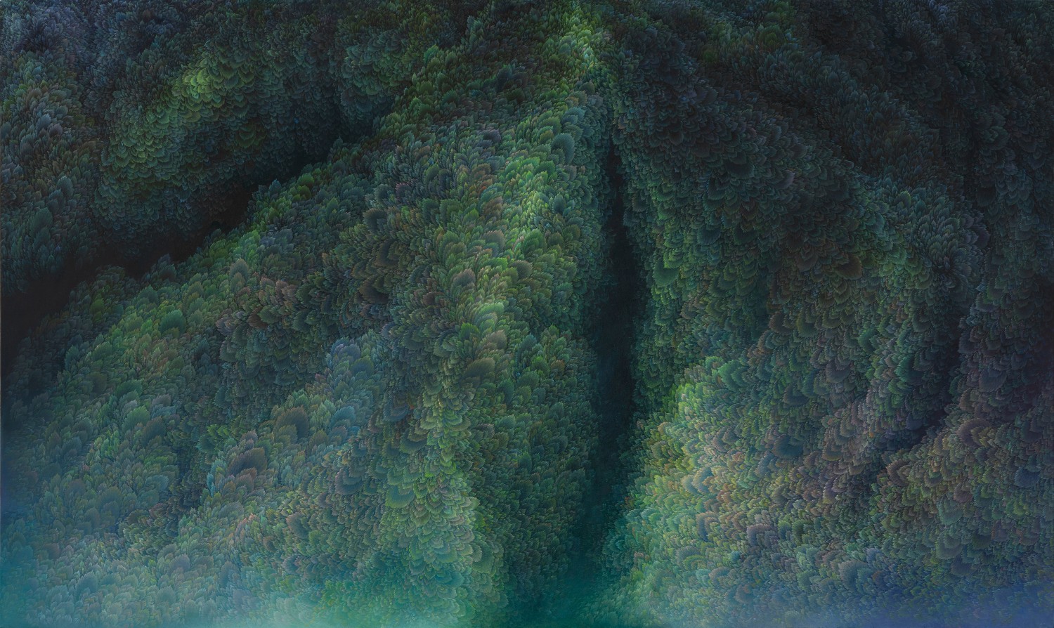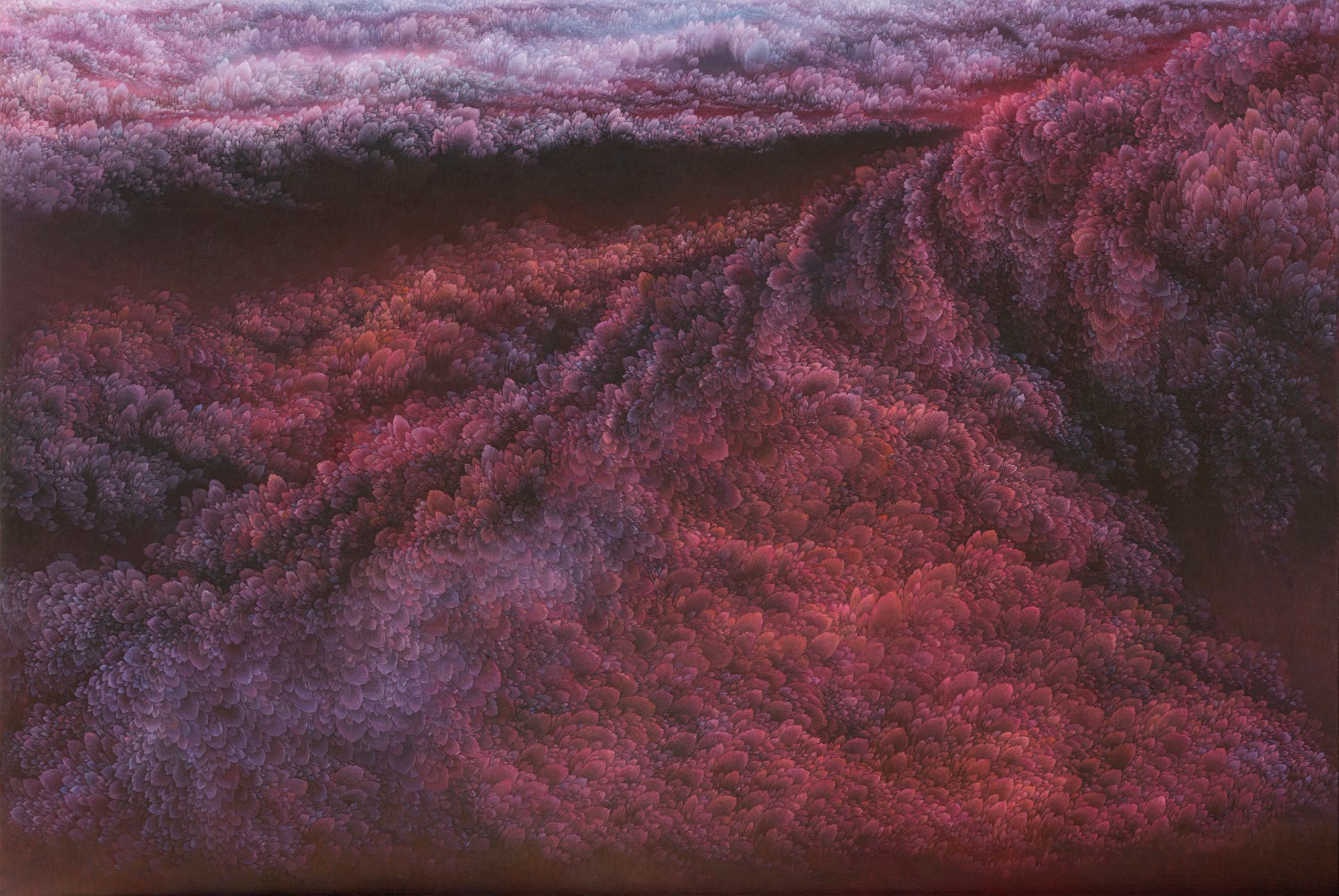 While refusing the use of a fixed viewpoint, artist Jinwook Yeom expresses her intention of rejection in her series of forest-painting. In her painting, brush strokes are visualized in monochrome patterns, and the prevalent monochrome images structure the canvas. The gaze moves along the monotone fluently and dynamically. Thus you can read the images of the forest-painting at your will from the sky to the earth or from top to bottom. The tone fading from the mountain top to the ridges receding endlessly is flowing. The artist replaces the nature of painting that is essentially executed on the flat surface with the structure of the forest, and adjusts it in dark tone. Such structure of the canvas as hers tends to surpass landscape painting as a modern and contemporary genre and to be disparate from local landscape painting at home and abroad. The canvas structure exclusively built up with colors and brush strokes is featured in dark or bright monotone, rendering the structure of the forest-painting diverse. Let us read the painting. The center of the canvas splitting left and right and stretching out. The image winding across the canvas from the left top toward the right bottom. Dark sides beginning from the bottom getting slowly brightened through layering. Dark sides of the bottom flowing into the darkness along the free-ranging line. Contemplating the structure of the forest-painting is also dynamic as well as unrestricted. It is not about rejecting the one-dimensional quality of painting but about how to read the image of the forest. You can freely follow the images structured on the large rectangular canvas ―extending out across the canvas like erupting volcanoes, or extending from side to side along the rainbow rising from the top right side, or crossing the upper part of the canvas and extending to the left and the right. The images even happen to disappear out of the canvas.