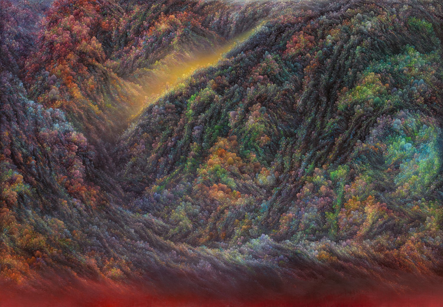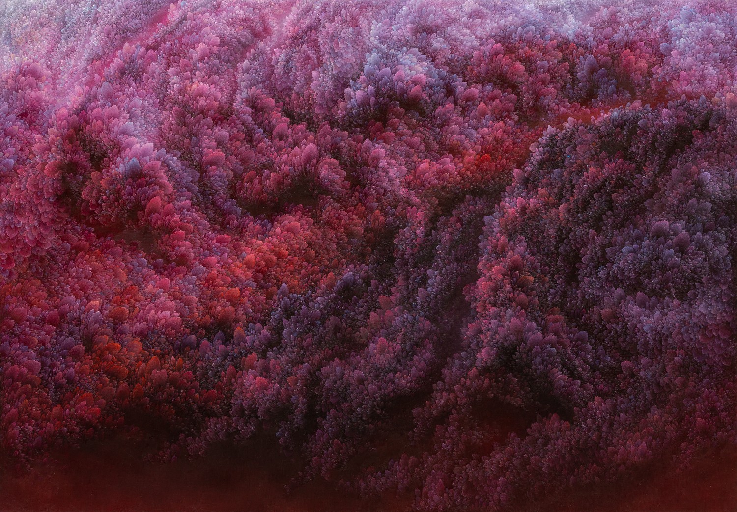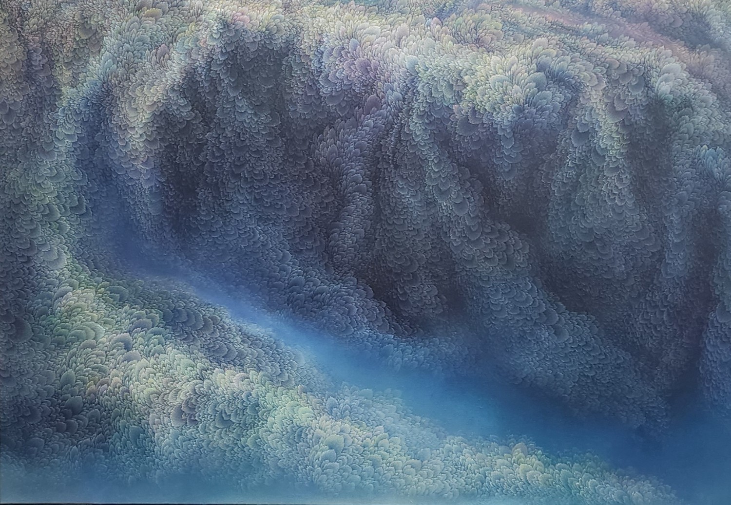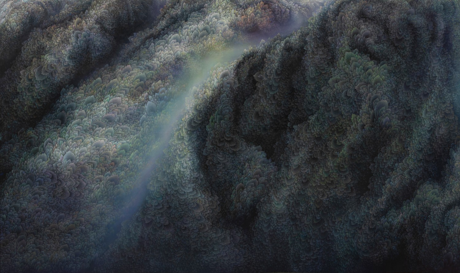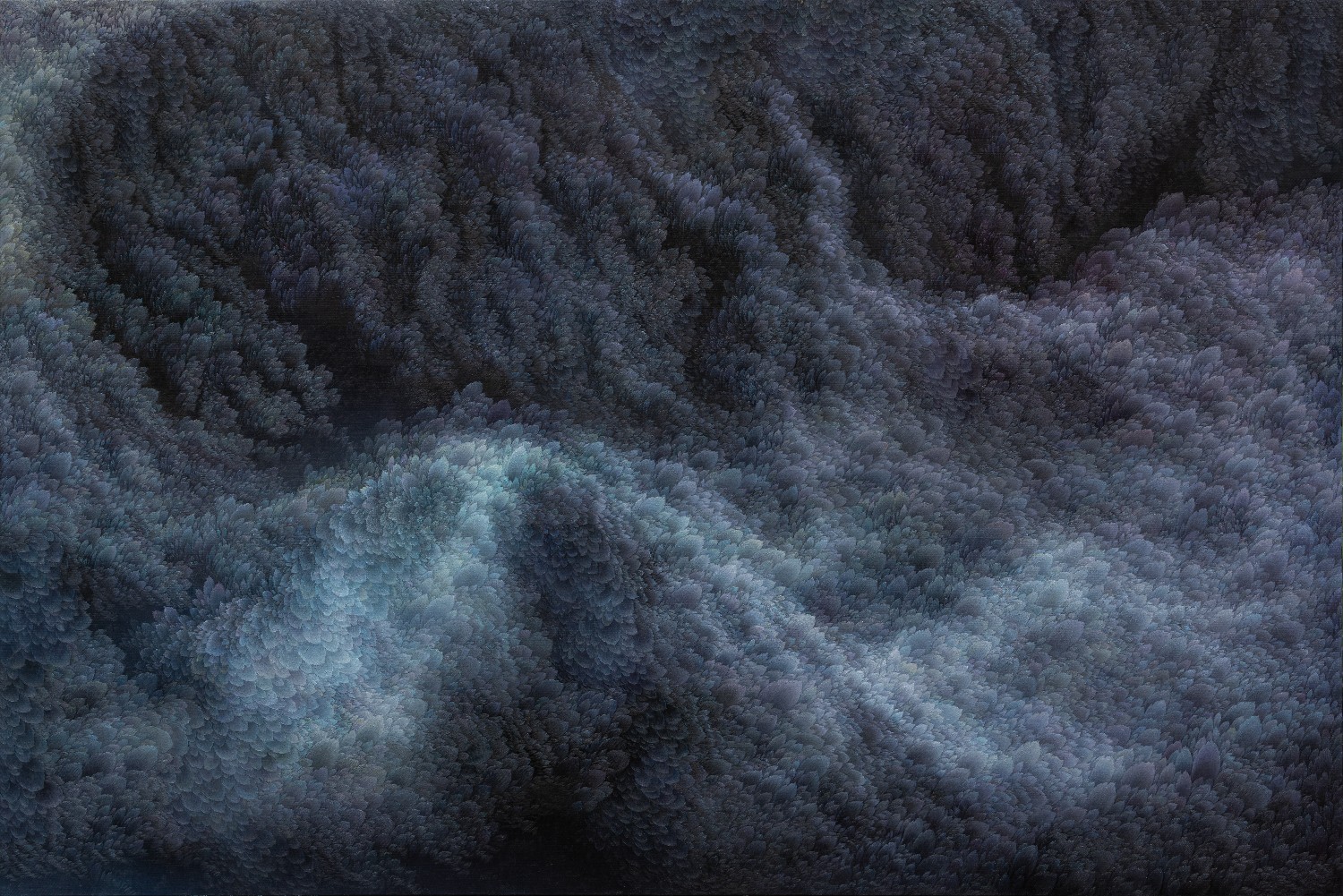 While refusing the use of a fixed viewpoint, artist Jinwook Yeom expresses her intention of rejection in her series of forest-painting. In her painting, brush strokes are visualized in monochrome patterns, and the prevalent monochrome images structure the canvas. The gaze moves along the monotone fluently and dynamically. Thus you can read the images of the forest-painting at your will from the sky to the earth or from top to bottom. The tone fading from the mountain top to the ridges receding endlessly is flowing. The artist replaces the nature of painting that is essentially executed on the flat surface with the structure of the forest, and adjusts it in dark tone. Such structure of the canvas as hers tends to surpass landscape painting as a modern and contemporary genre and to be disparate from local landscape painting at home and abroad. The canvas structure exclusively built up with colors and brush strokes is featured in dark or bright monotone, rendering the structure of the forest-painting diverse. Let us read the painting. The center of the canvas splitting left and right and stretching out. The image winding across the canvas from the left top toward the right bottom. Dark sides beginning from the bottom getting slowly brightened through layering. Dark sides of the bottom flowing into the darkness along the free-ranging line. Contemplating the structure of the forest-painting is also dynamic as well as unrestricted. It is not about rejecting the one-dimensional quality of painting but about how to read the image of the forest. You can freely follow the images structured on the large rectangular canvas ―extending out across the canvas like erupting volcanoes, or extending from side to side along the rainbow rising from the top right side, or crossing the upper part of the canvas and extending to the left and the right. The images even happen to disappear out of the canvas.