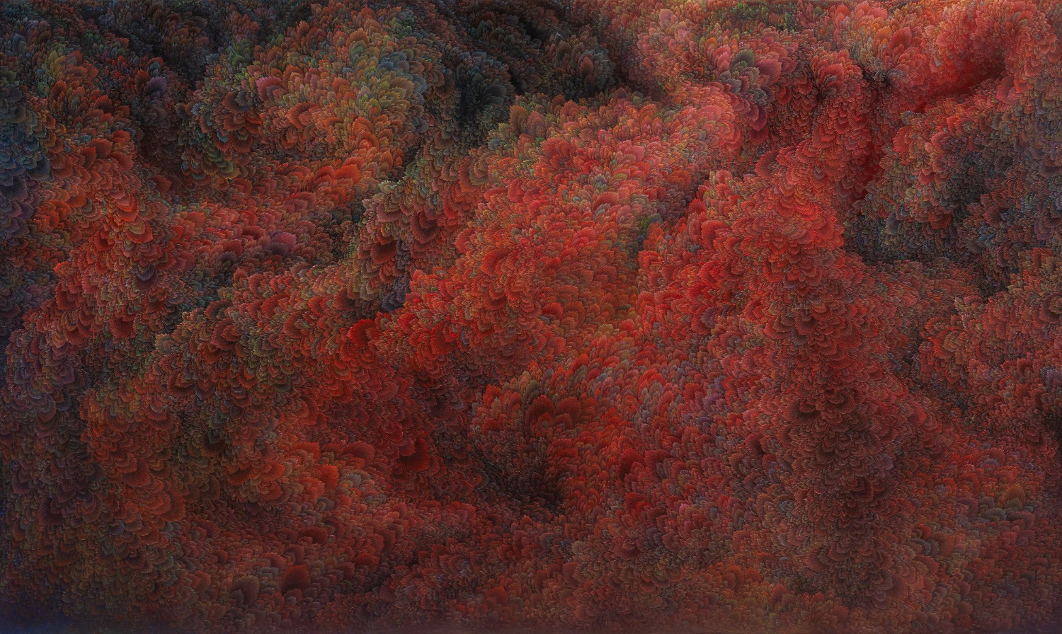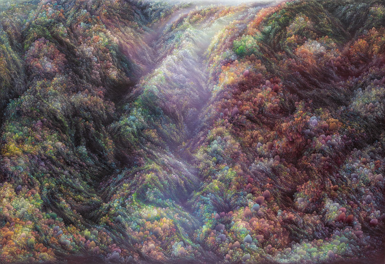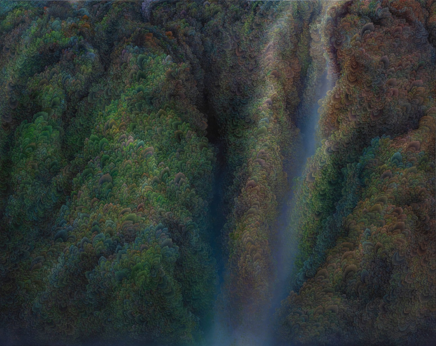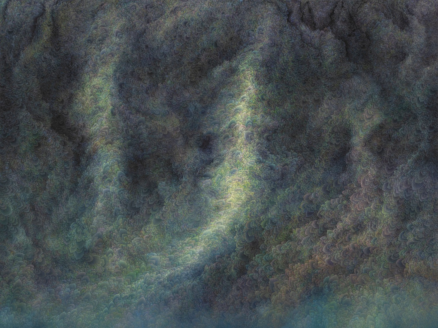 While refusing the use of a fixed viewpoint, artist Jinwook Yeom expresses her intention of rejection in her series of forest-painting. In her painting, brush strokes are visualized in monochrome patterns, and the prevalent monochrome images structure the canvas. The gaze moves along the monotone fluently and dynamically. Thus you can read the images of the forest-painting at your will from the sky to the earth or from top to bottom. The tone fading from the mountain top to the ridges receding endlessly is flowing. The artist replaces the nature of painting that is essentially executed on the flat surface with the structure of the forest, and adjusts it in dark tone. Such structure of the canvas as hers tends to surpass landscape painting as a modern and contemporary genre and to be disparate from local landscape painting at home and abroad. The canvas structure exclusively built up with colors and brush strokes is featured in dark or bright monotone, rendering the structure of the forest-painting diverse. Let us read the painting. The center of the canvas splitting left and right and stretching out. The image winding across the canvas from the left top toward the right bottom. Dark sides beginning from the bottom getting slowly brightened through layering. Dark sides of the bottom flowing into the darkness along the free-ranging line. Contemplating the structure of the forest-painting is also dynamic as well as unrestricted. It is not about rejecting the one-dimensional quality of painting but about how to read the image of the forest. You can freely follow the images structured on the large rectangular canvas ―extending out across the canvas like erupting volcanoes, or extending from side to side along the rainbow rising from the top right side, or crossing the upper part of the canvas and extending to the left and the right. The images even happen to disappear out of the canvas.