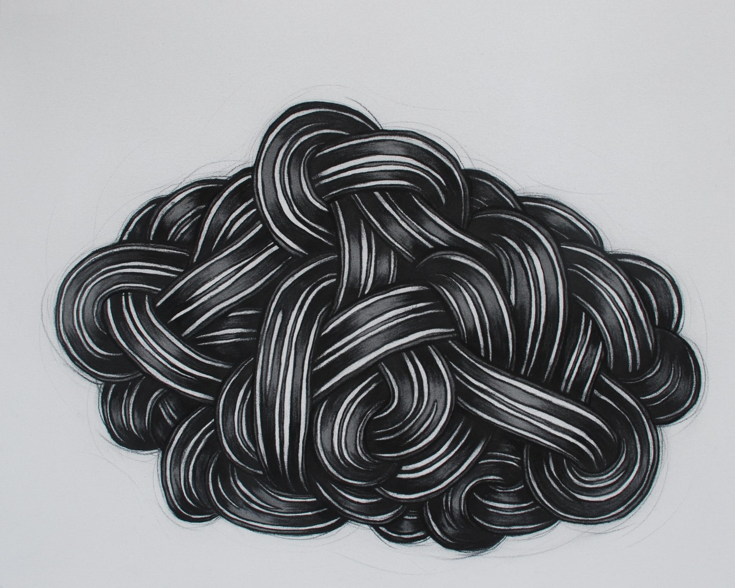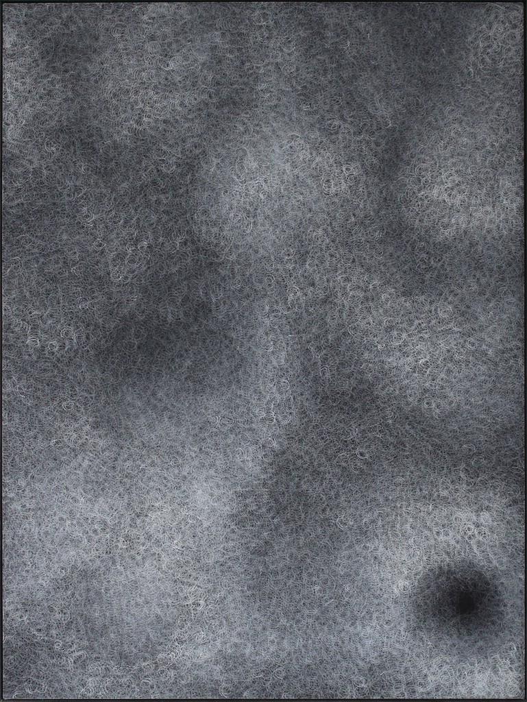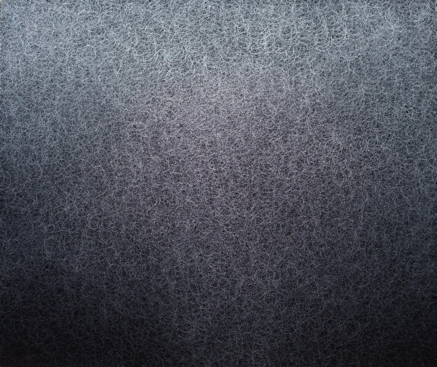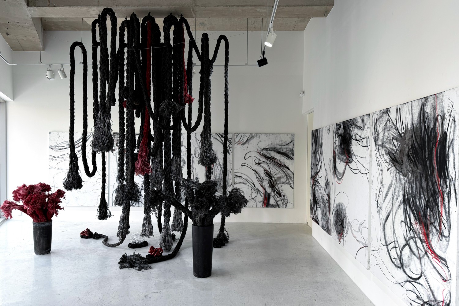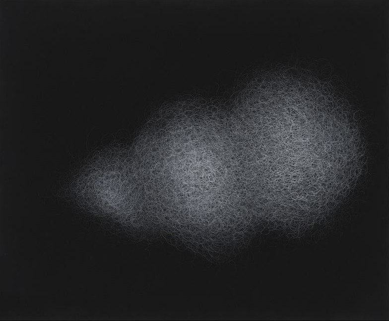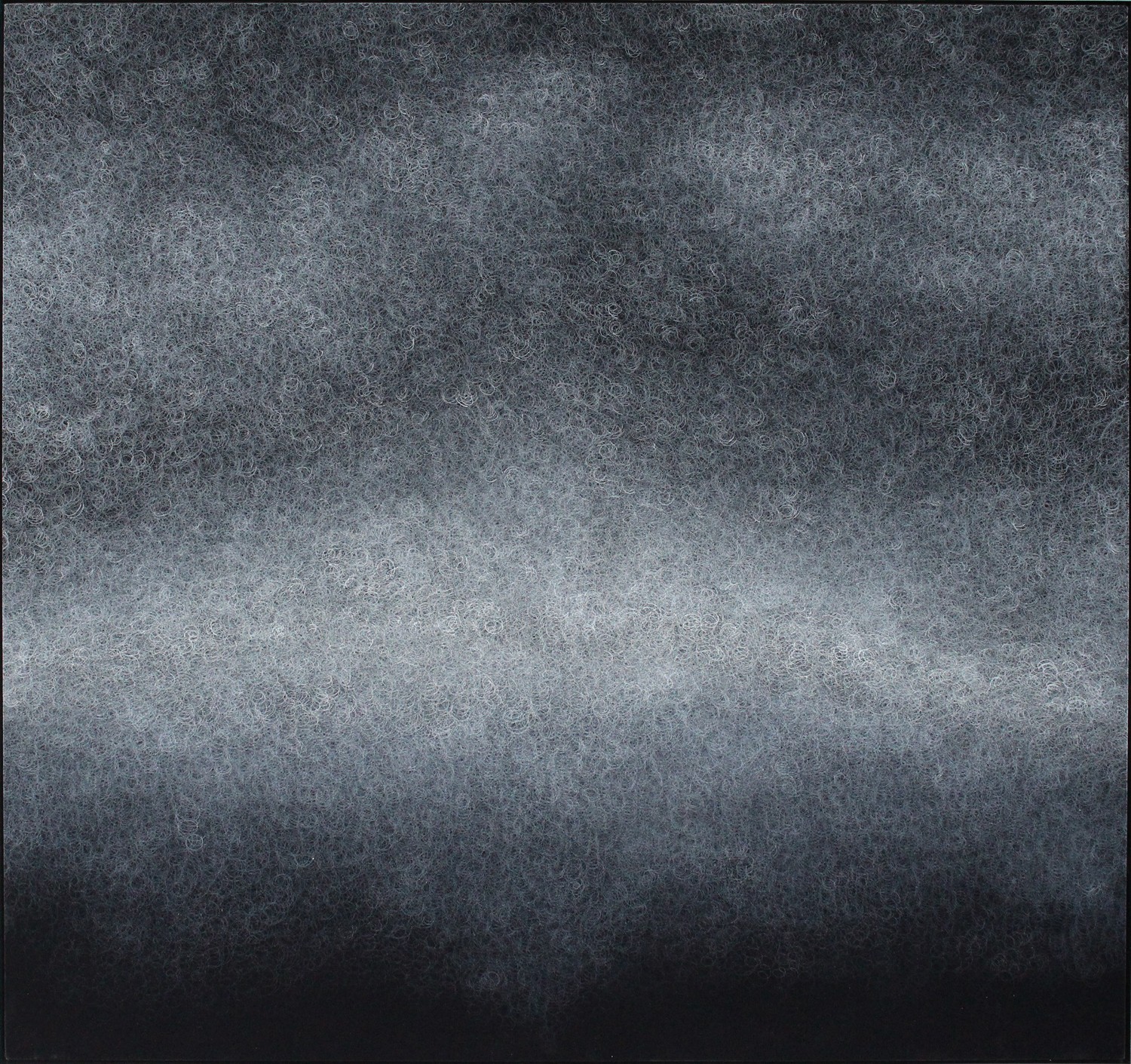 Sangsun Bae has been making two types of paintings: one type made using blueblack ink and charcoal on white surfaces coated with gesso mixed with the blue-black ink, and another type made by drawing countless fine lines of gesso using a fine-point brush on surfaces of black velvet in a way that brings out the jet-black color. These works have their origins in abstracted profile lines extracted from figure sketches, and they thus carry a rhythm of organic lines that relate to the bonds that are formed between lives and also to her current knotted forms. Bae, who started off by drawing people in order to better understand herself, eventually developed an interest in the very movements of people. While exploring her thoughts through delving into the questions of what it means to be human and what it means to live, she eventually began to focus on the subtle changes in the air that occur between two posing models set in the different combinations of woman-woman, man-man, or man-woman. Here lies an important concept of Bae, who has discovered the imperceptible and indefinite aura or energy generated and exchanged between people that constantly shifts in direction and strength.
