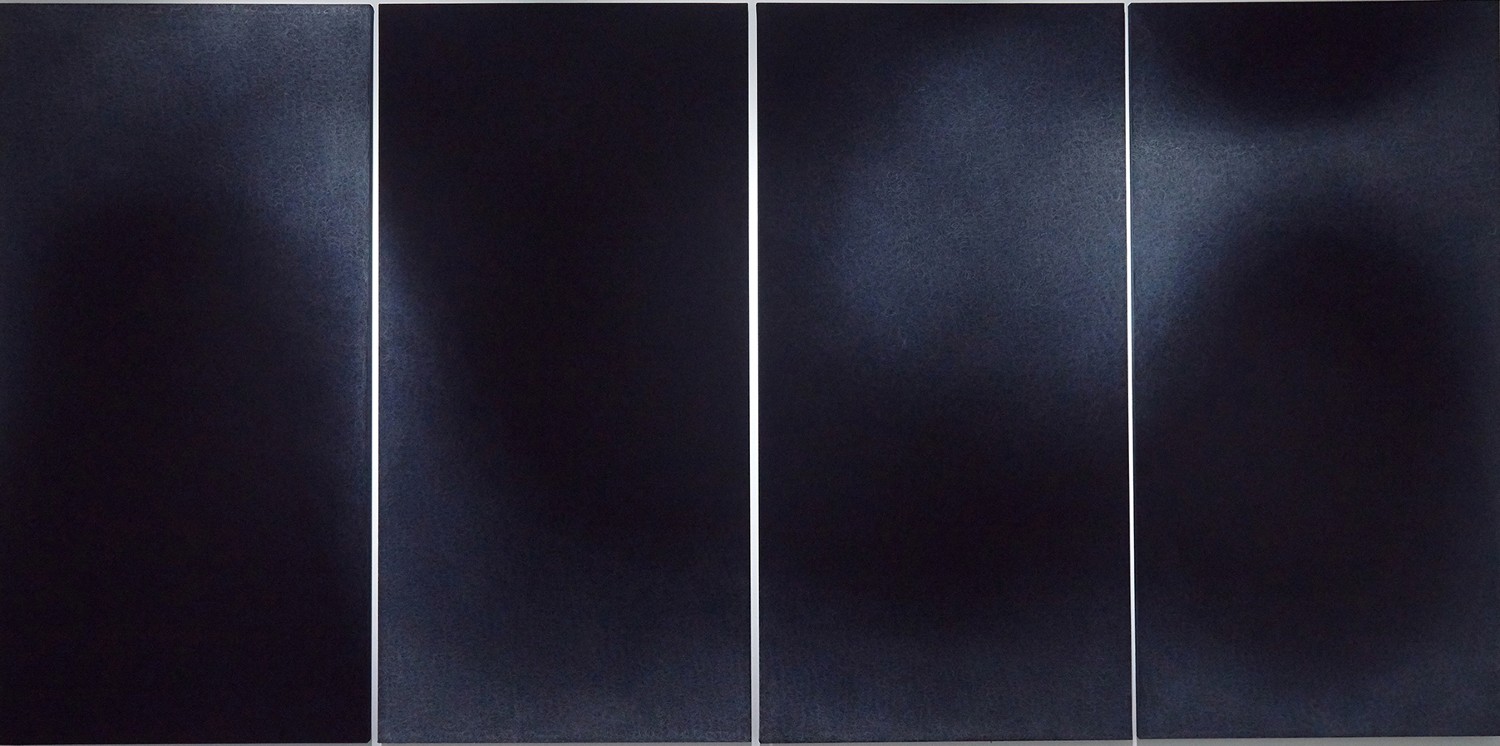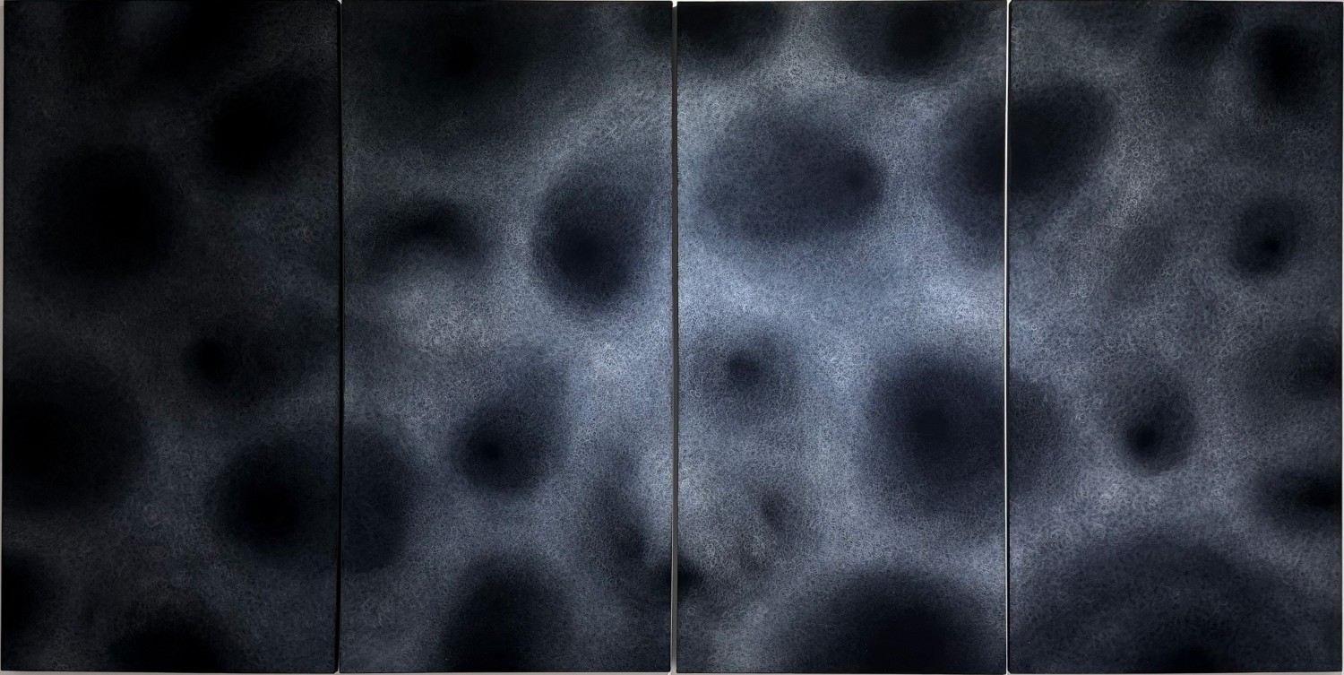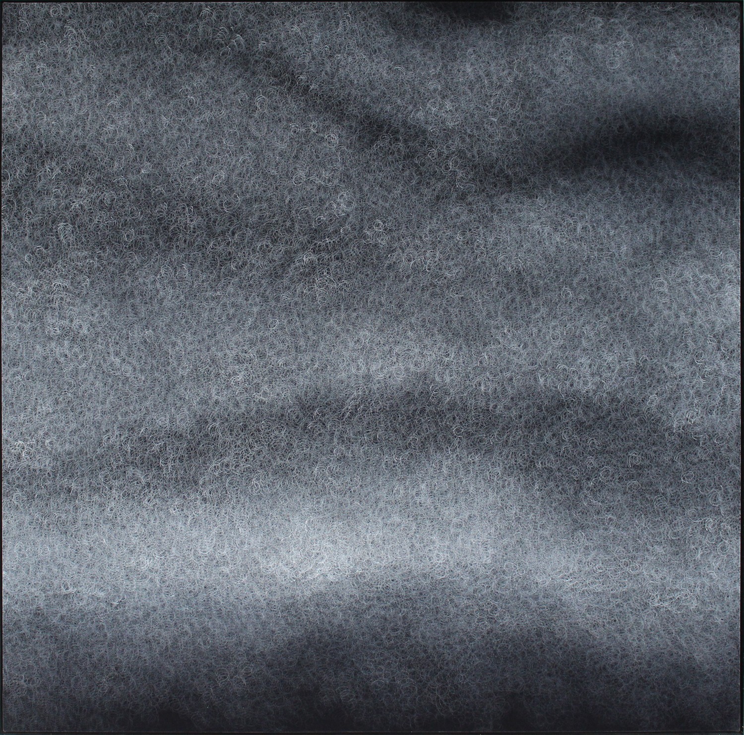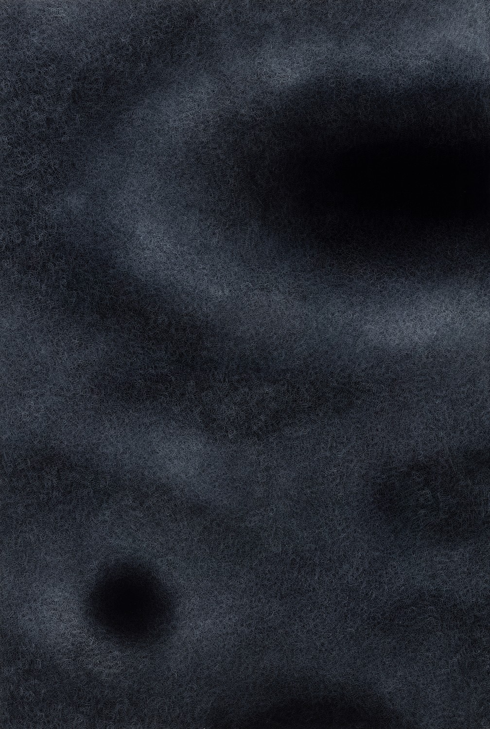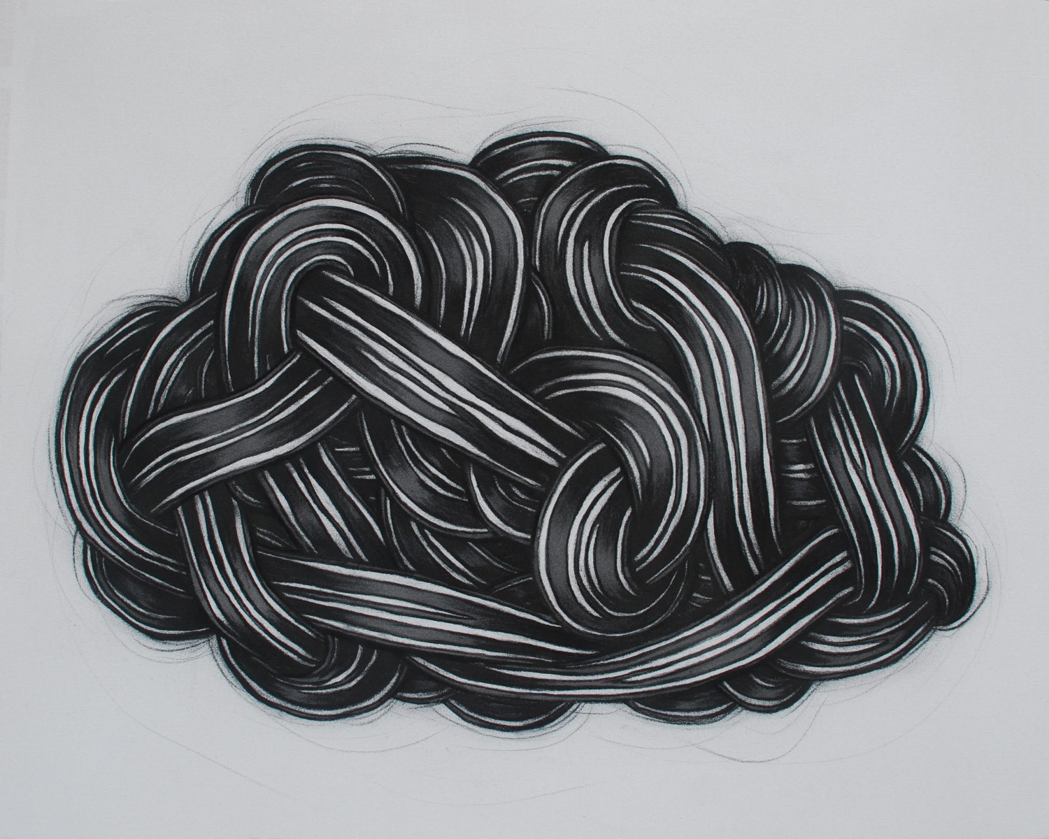 Sangsun Bae has been making two types of paintings: one type made using blueblack ink and charcoal on white surfaces coated with gesso mixed with the blue-black ink, and another type made by drawing countless fine lines of gesso using a fine-point brush on surfaces of black velvet in a way that brings out the jet-black color. These works have their origins in abstracted profile lines extracted from figure sketches, and they thus carry a rhythm of organic lines that relate to the bonds that are formed between lives and also to her current knotted forms. Bae, who started off by drawing people in order to better understand herself, eventually developed an interest in the very movements of people. While exploring her thoughts through delving into the questions of what it means to be human and what it means to live, she eventually began to focus on the subtle changes in the air that occur between two posing models set in the different combinations of woman-woman, man-man, or man-woman. Here lies an important concept of Bae, who has discovered the imperceptible and indefinite aura or energy generated and exchanged between people that constantly shifts in direction and strength.