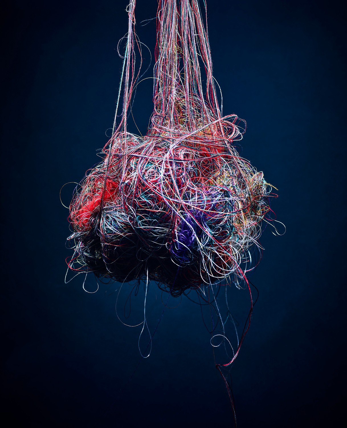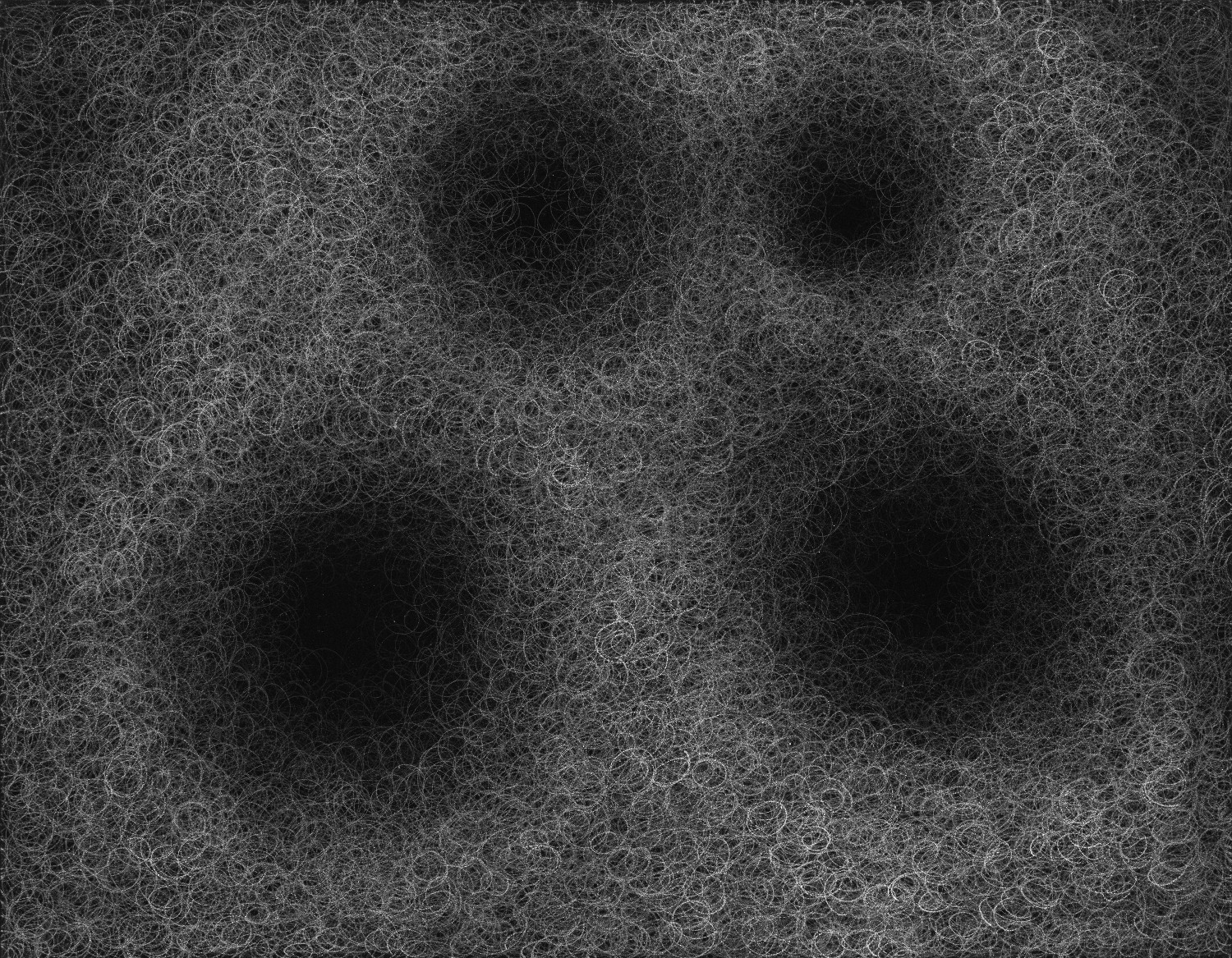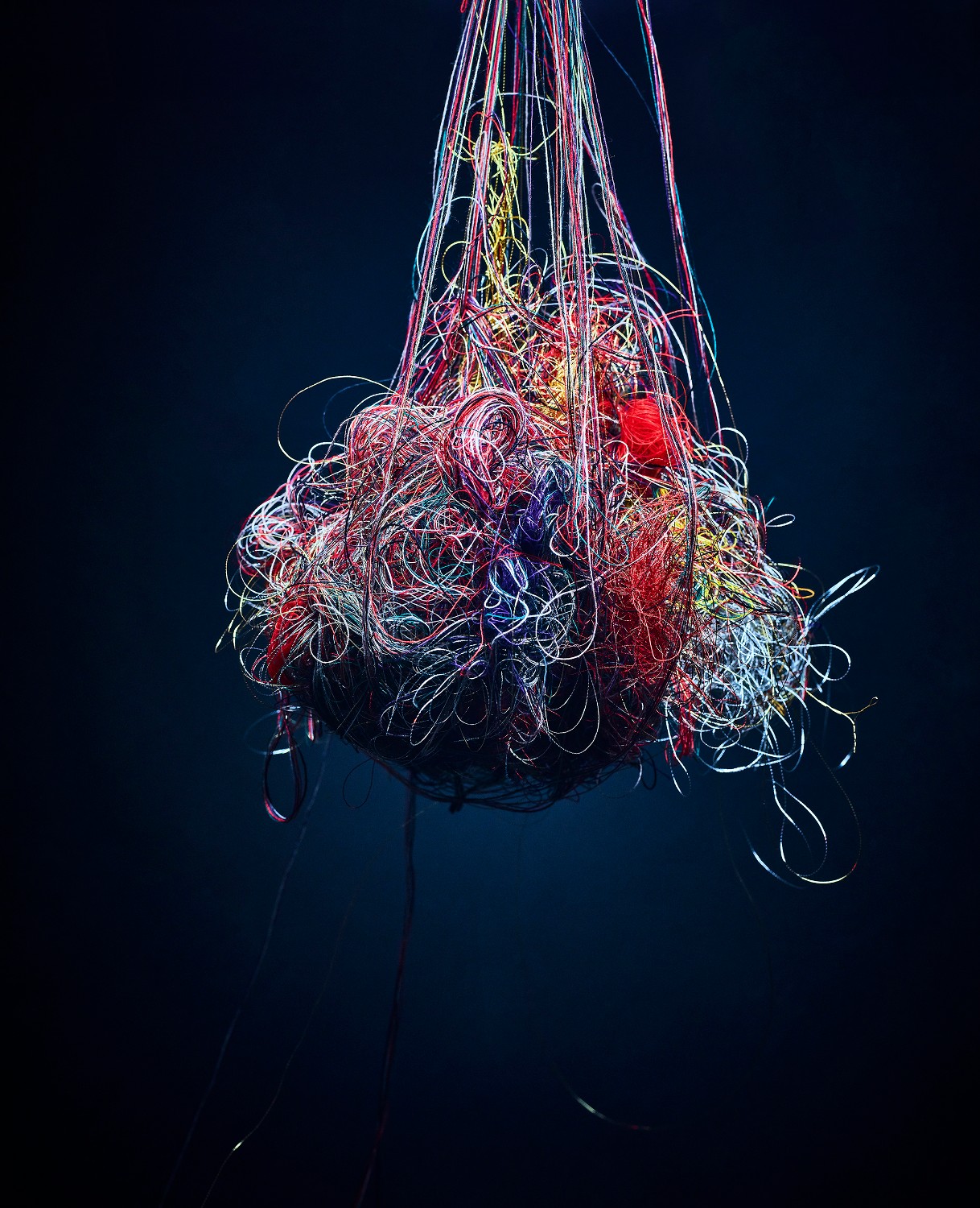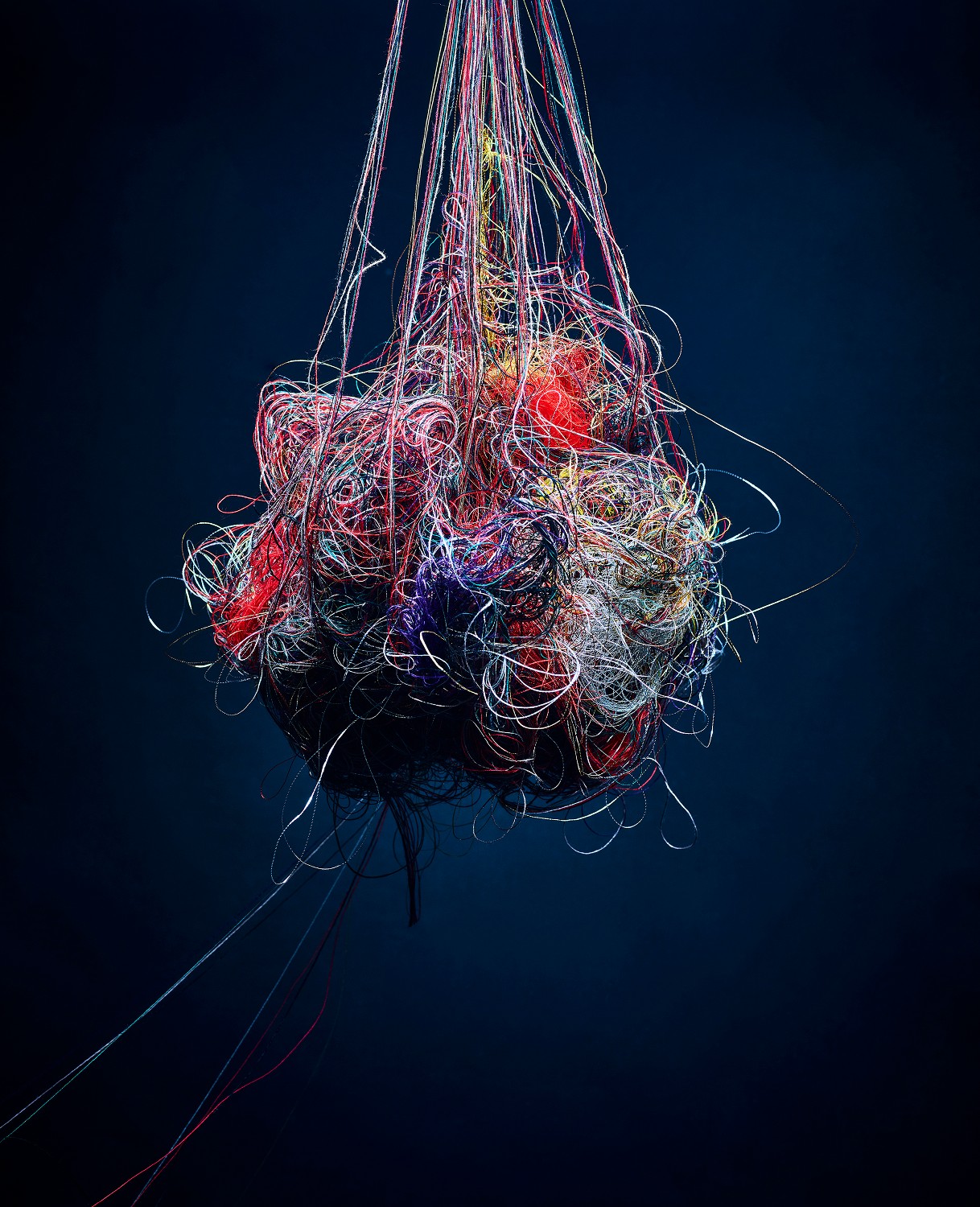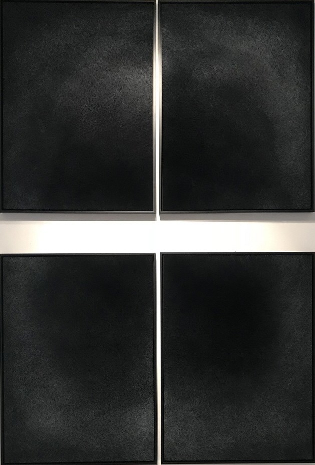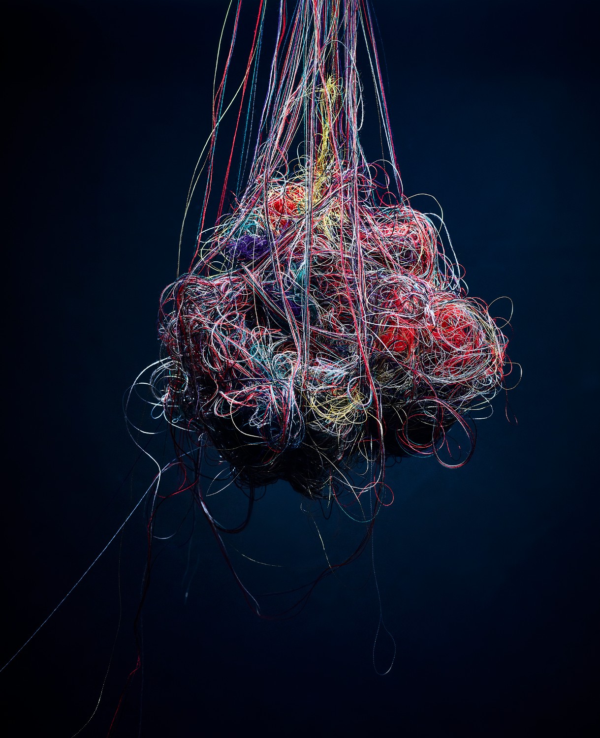 Sangsun Bae has been making two types of paintings: one type made using blueblack ink and charcoal on white surfaces coated with gesso mixed with the blue-black ink, and another type made by drawing countless fine lines of gesso using a fine-point brush on surfaces of black velvet in a way that brings out the jet-black color. These works have their origins in abstracted profile lines extracted from figure sketches, and they thus carry a rhythm of organic lines that relate to the bonds that are formed between lives and also to her current knotted forms. Bae, who started off by drawing people in order to better understand herself, eventually developed an interest in the very movements of people. While exploring her thoughts through delving into the questions of what it means to be human and what it means to live, she eventually began to focus on the subtle changes in the air that occur between two posing models set in the different combinations of woman-woman, man-man, or man-woman. Here lies an important concept of Bae, who has discovered the imperceptible and indefinite aura or energy generated and exchanged between people that constantly shifts in direction and strength.