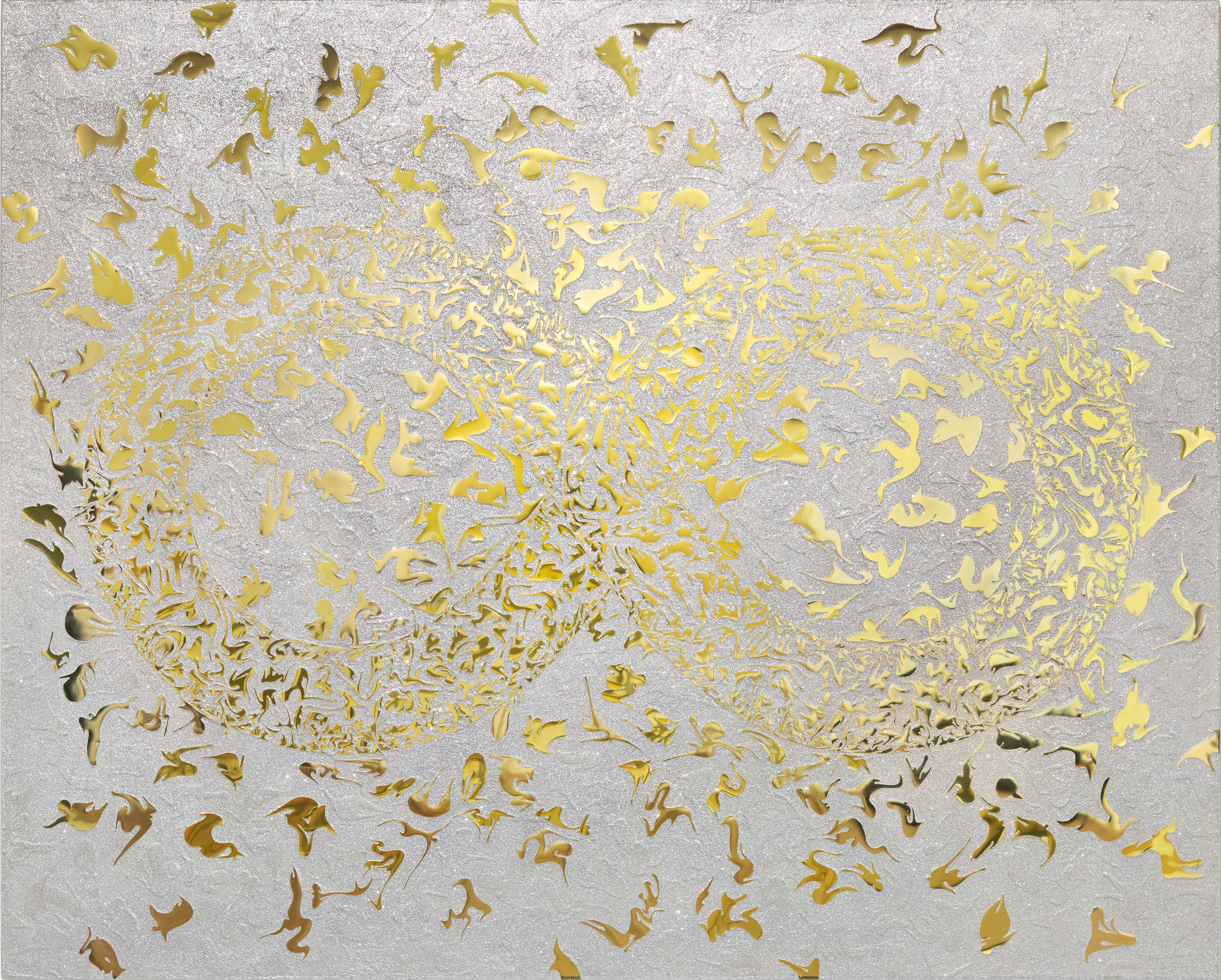 - Hand-cut mirror PET film and mixed media on canvas