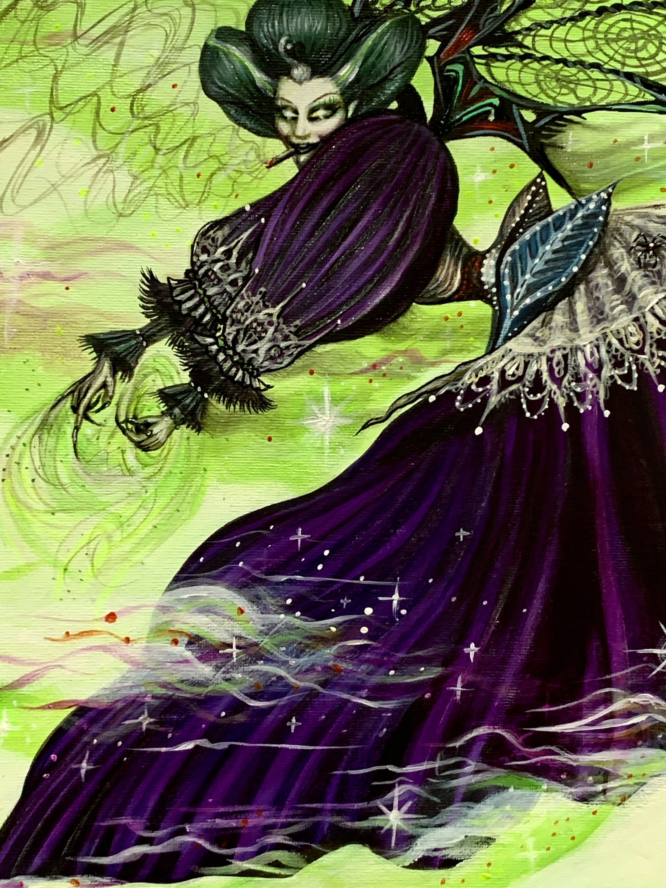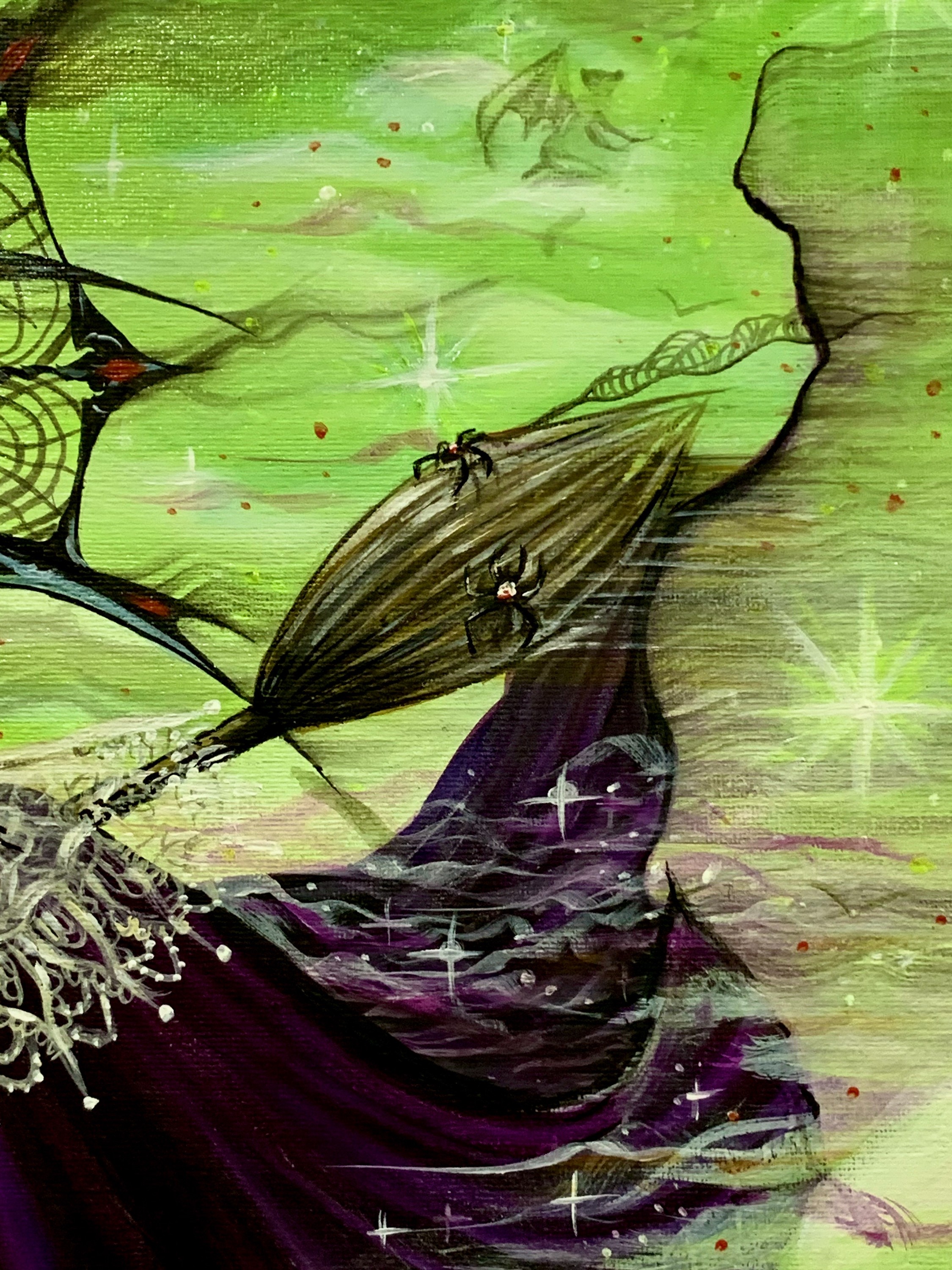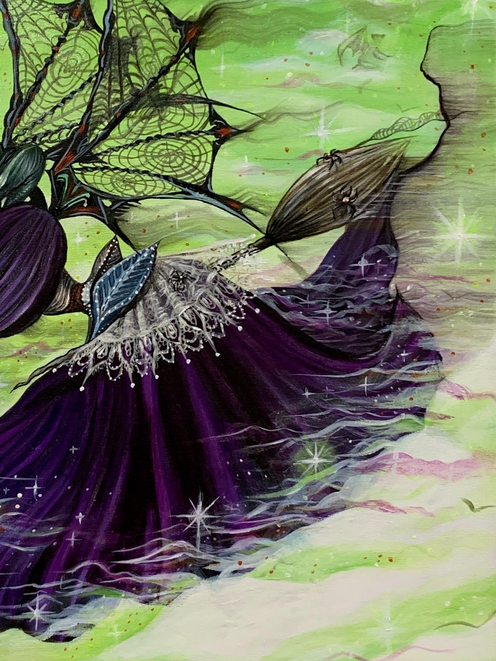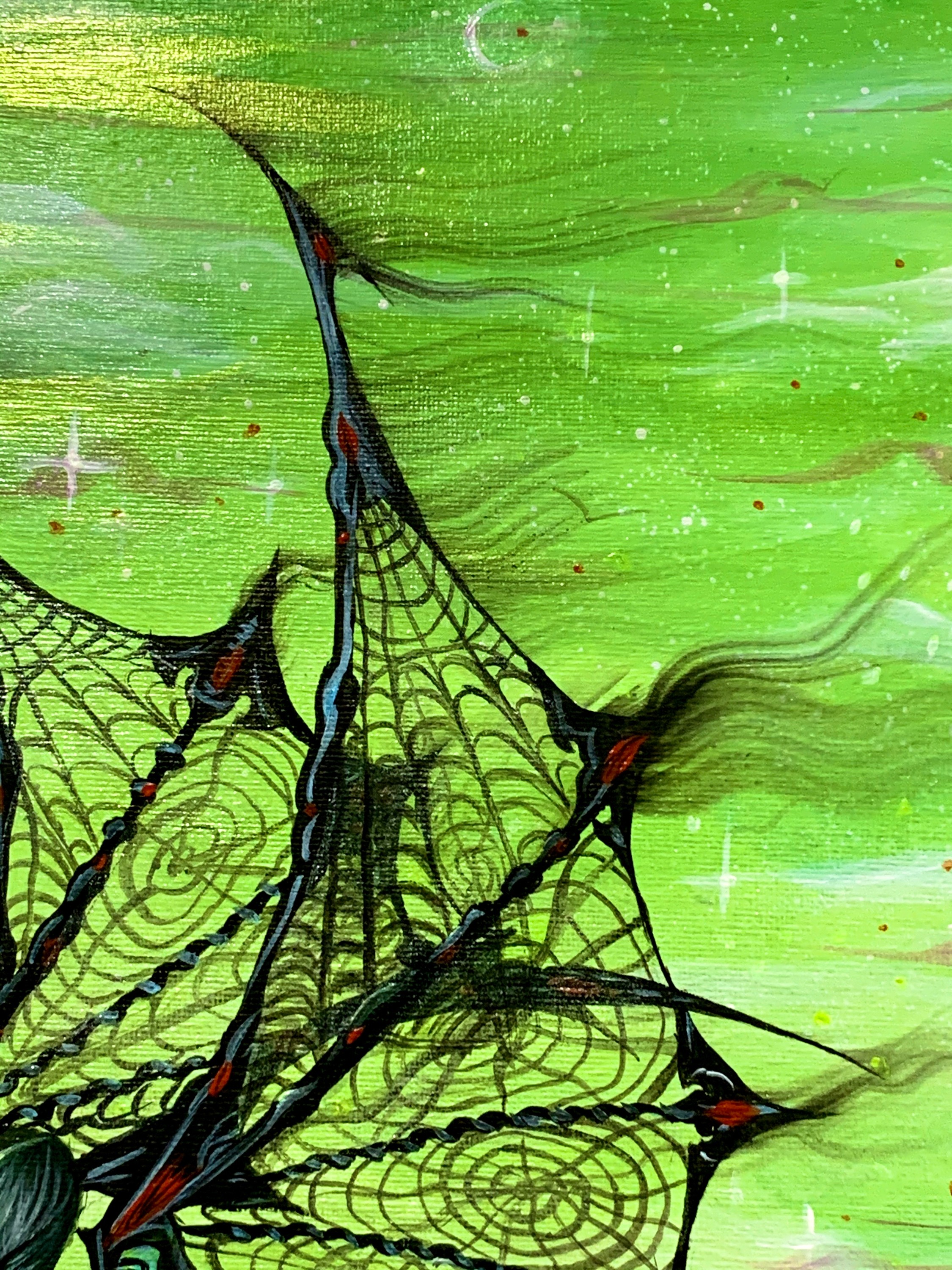 - Acrylic on canvas with iridescent medium, UV neon paint, and checkered peral boards