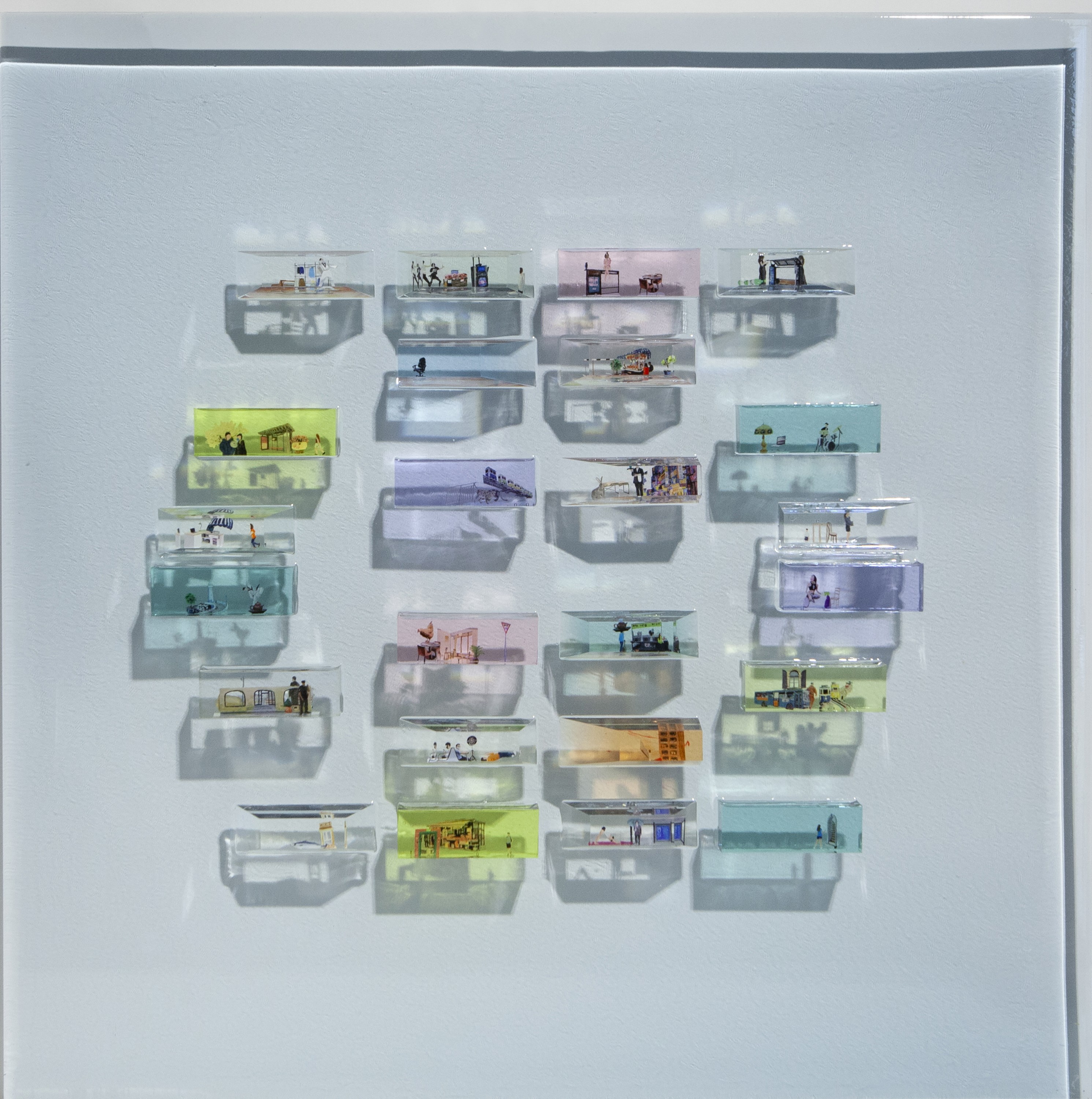 - Epoxy resin, acrylic paintings on overhead transparency, acrylic plate