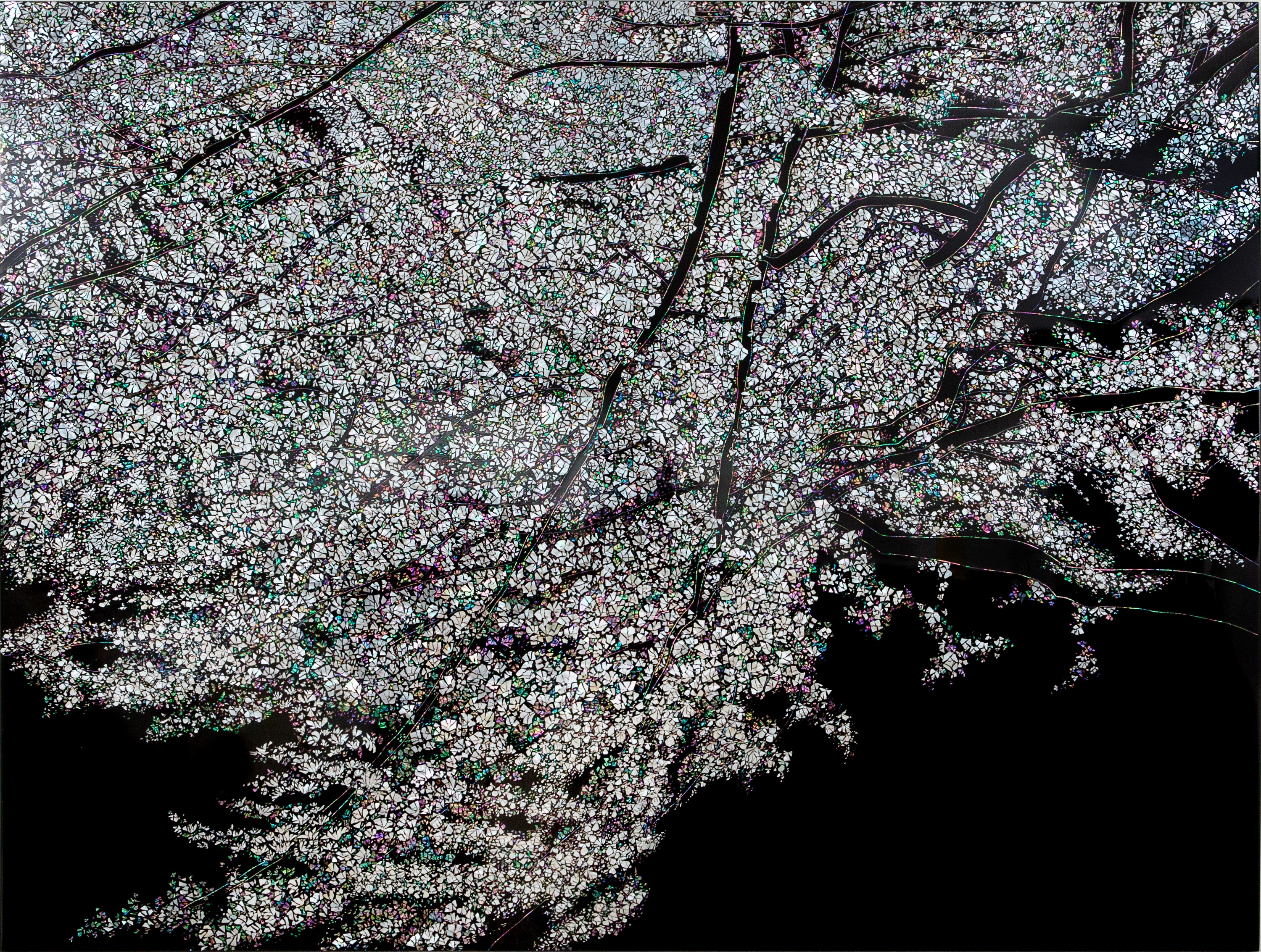 - Mother-of-pearl, hemp cloth on wood, natural lacquer