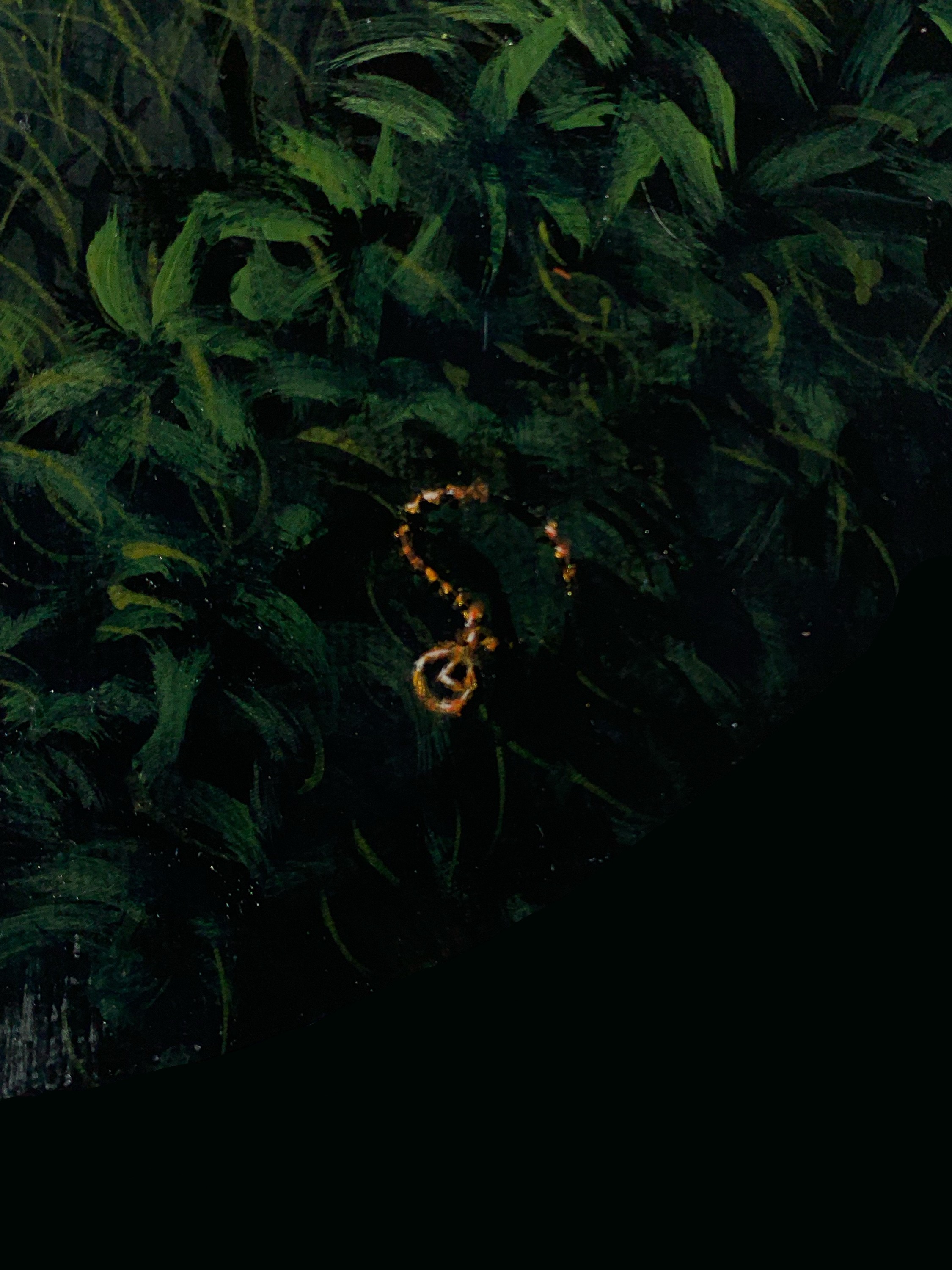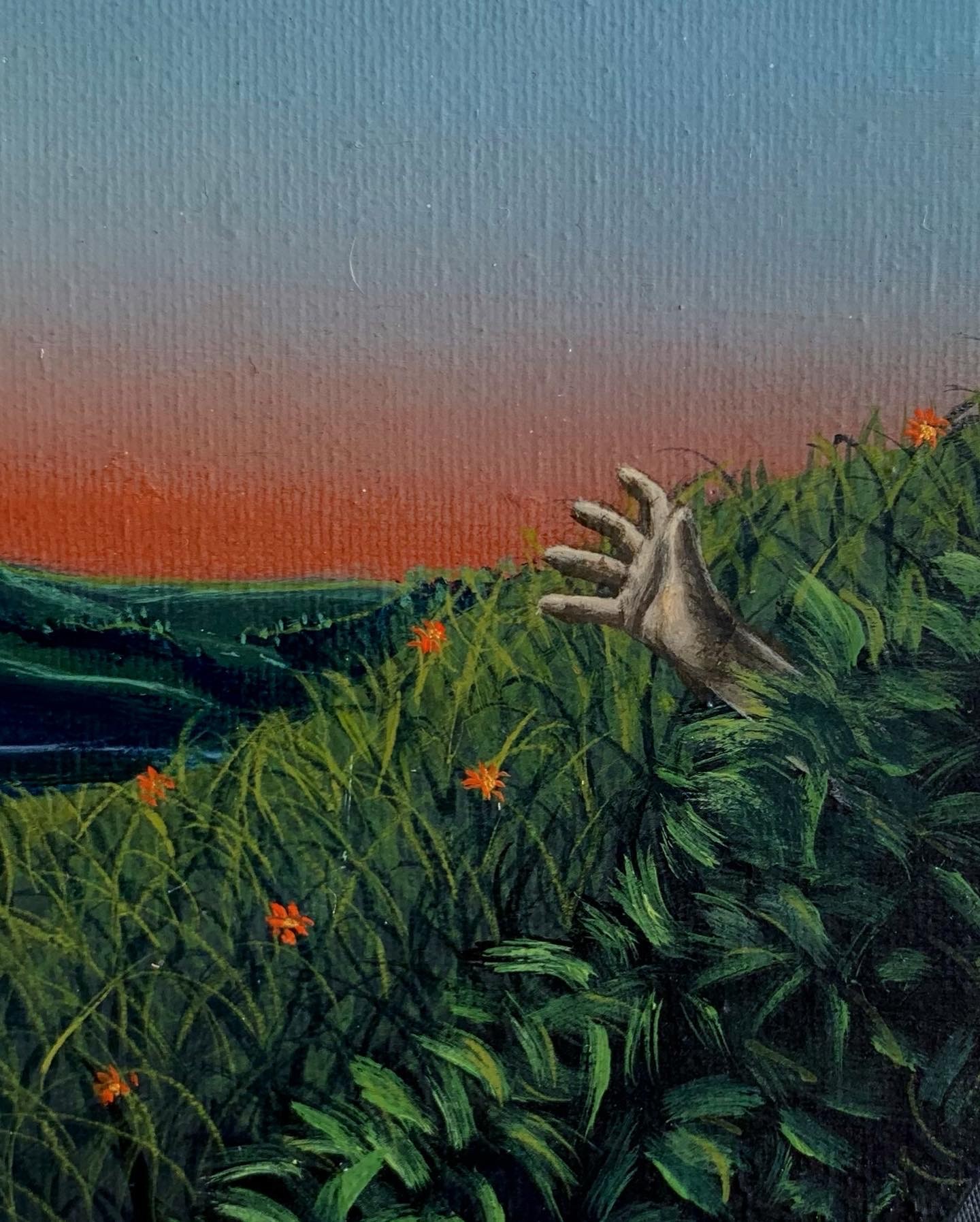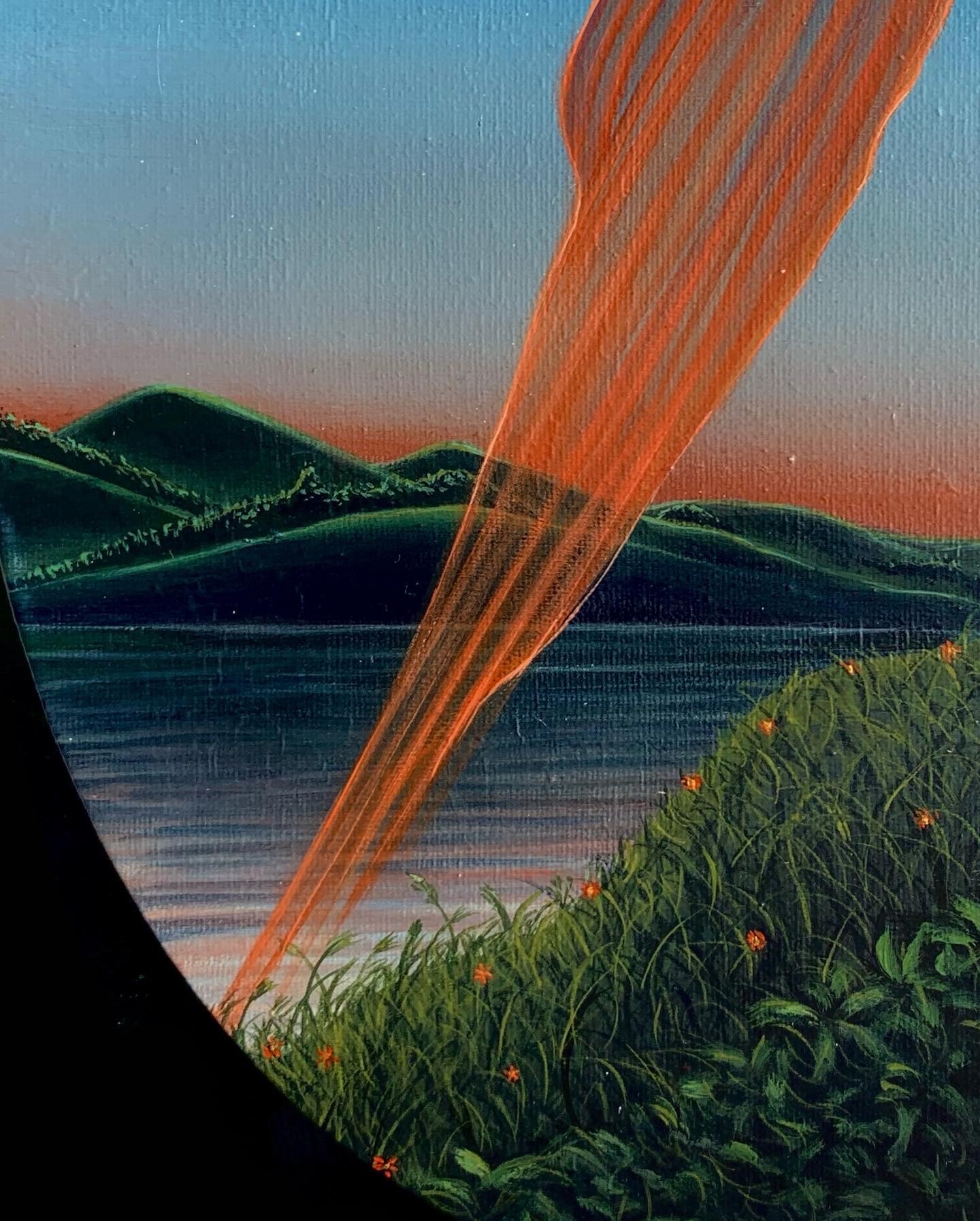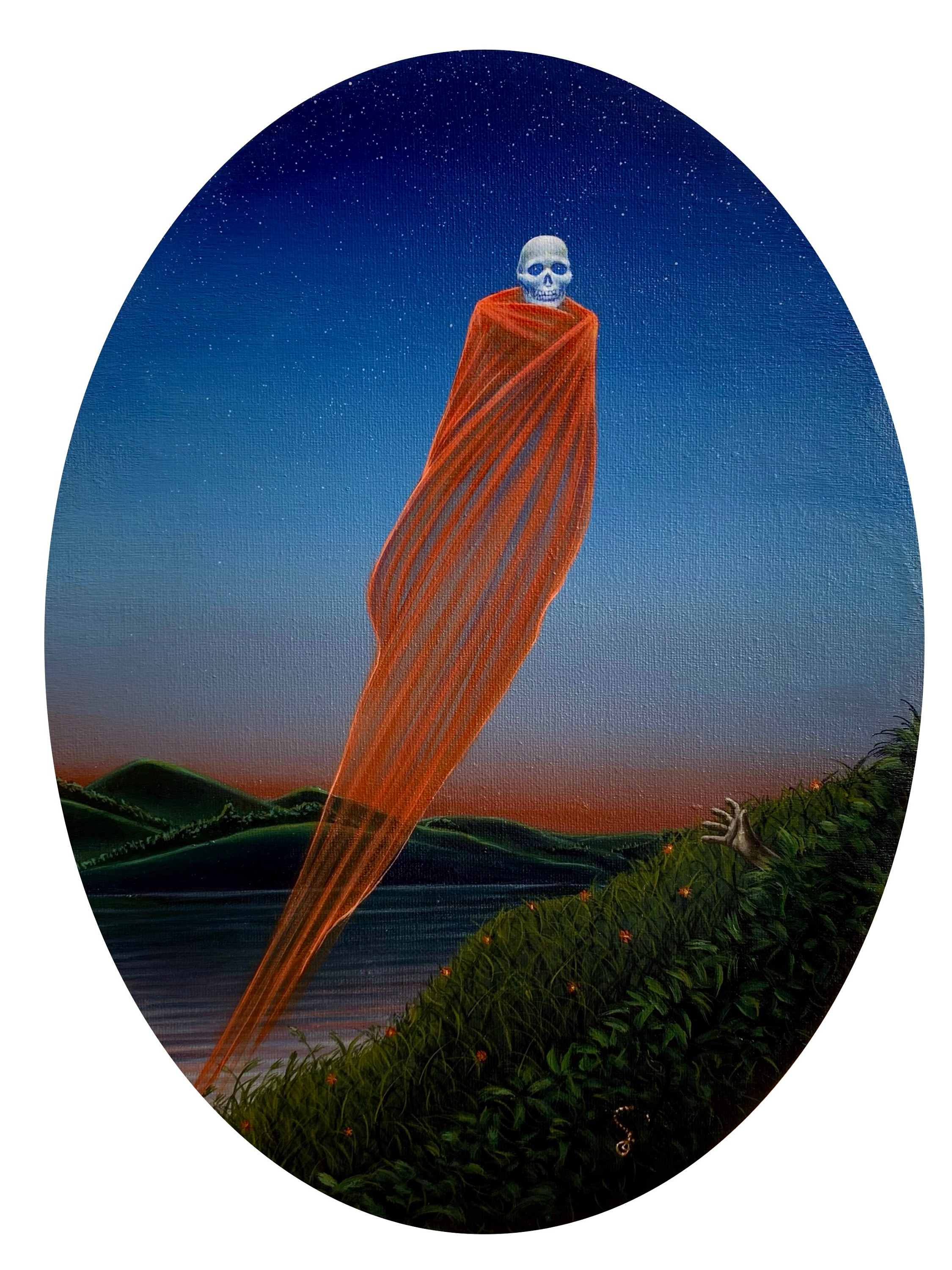 - Acrylic and gold pigment on oval canvas