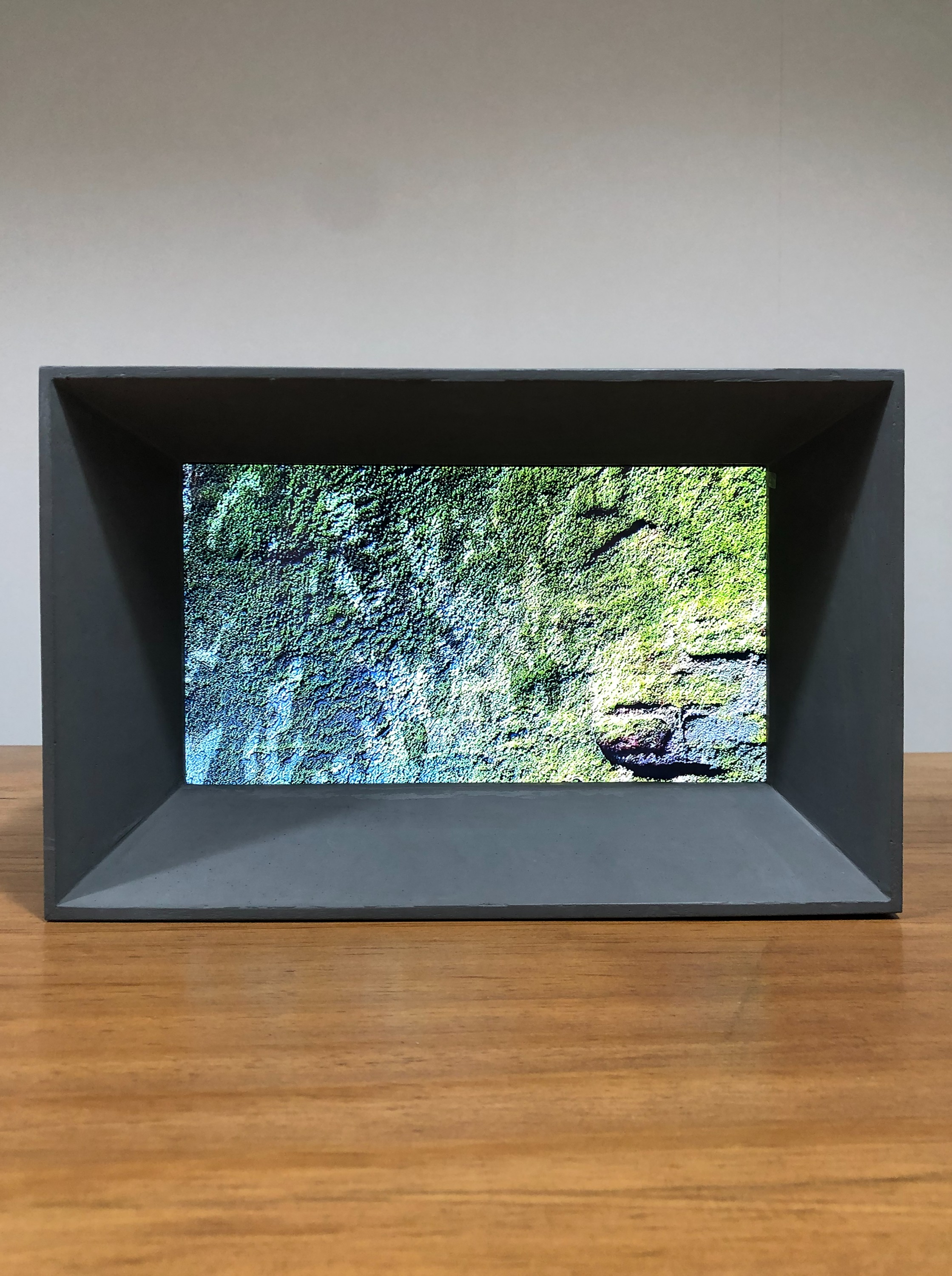 - Single-channel video on LED screen, sculptured framed by the artist